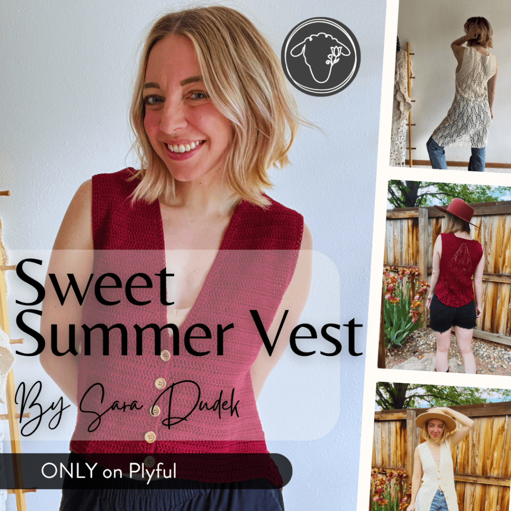 Her Plyful Design for the month of July is the Sweet Summer Vest, a lovely everyday staple with a lace back detail that will flatter you and will have you turning heads!!