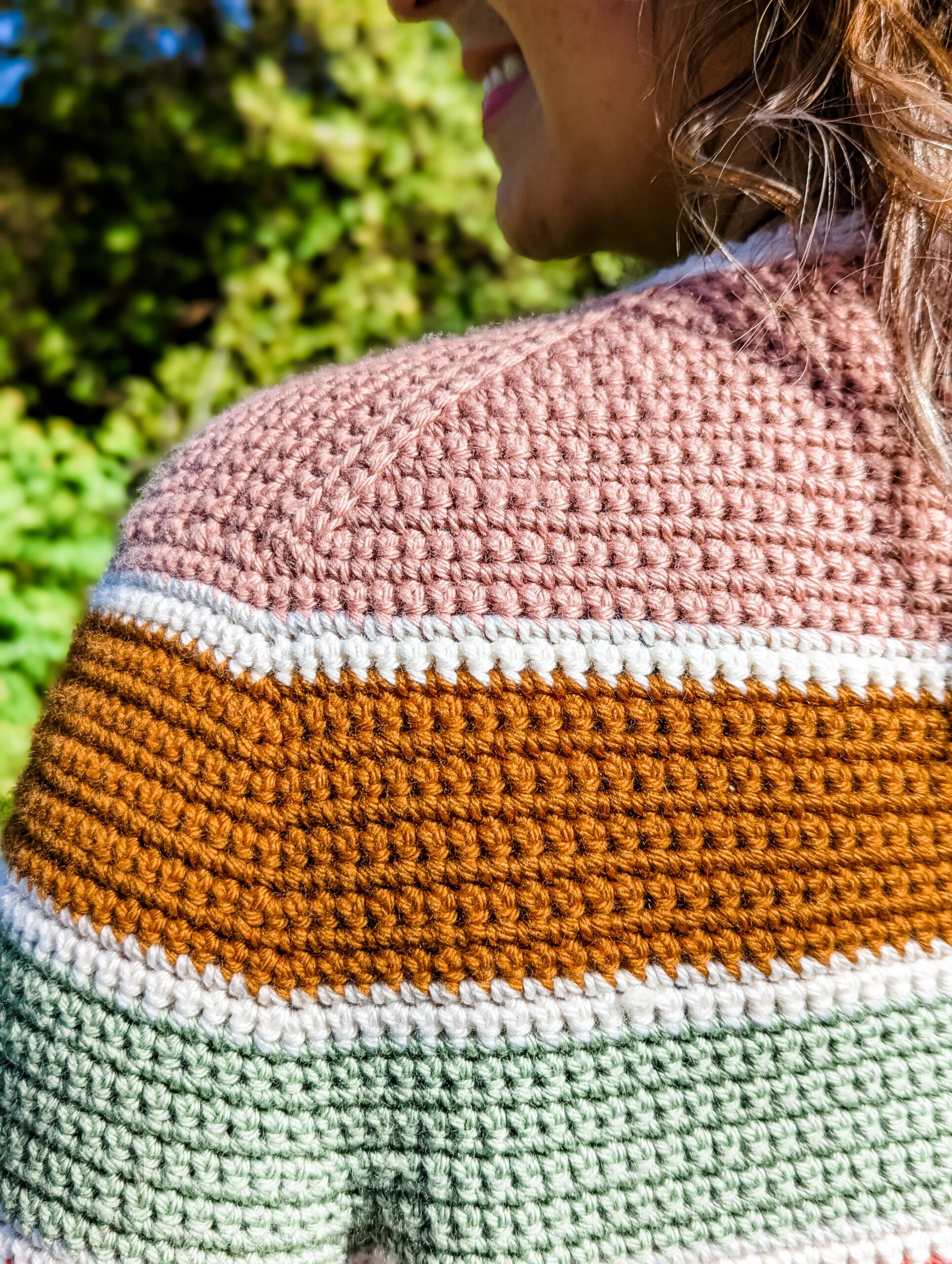 Striped sample used Sirdar, Country Classic Worsted (50% Merino Wool, 50% Acrylic; 100 g / 200 m (218 yds)) in colors Oyster (light pink), Toffee (brown), Moss (light green), Dusky Rose (pink), French Navy (blue), Ginger (orangy pink), and Golden (yellow).