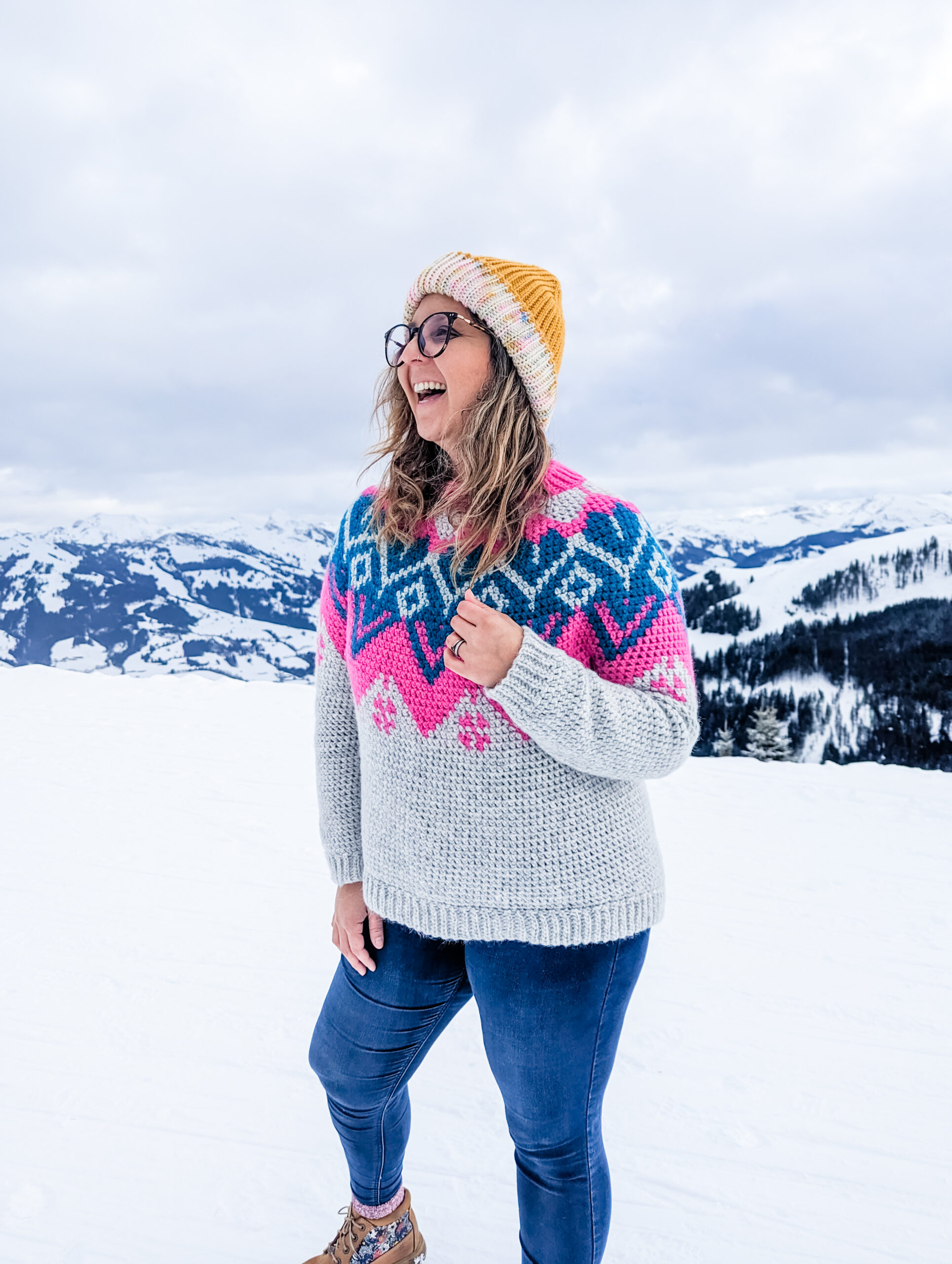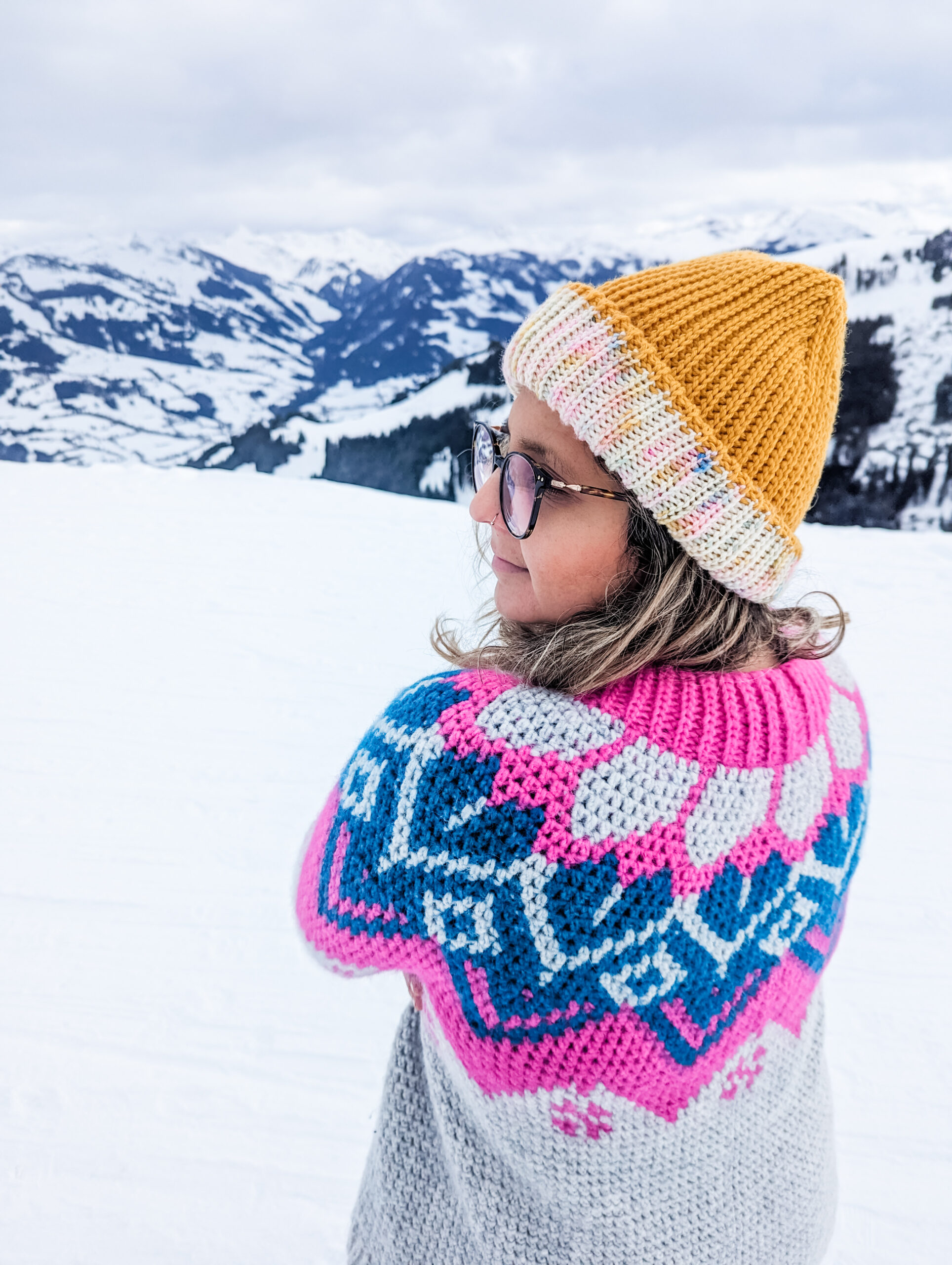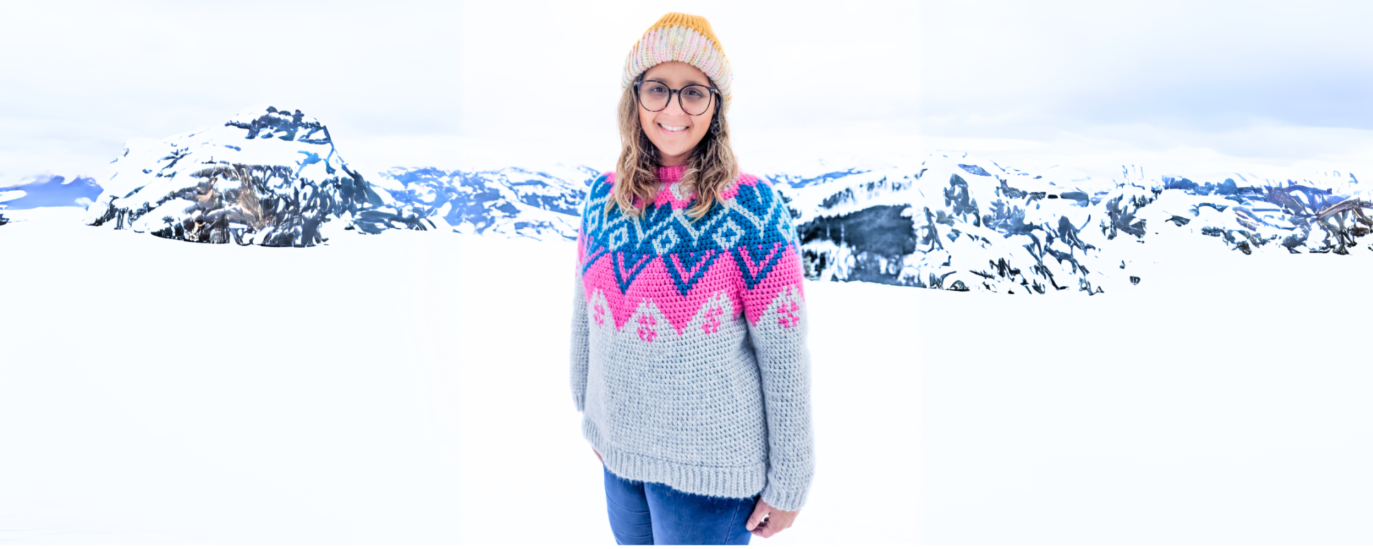 The Fogata Pullover is what cozy dreams are made of! Inspired by the classic Nordic round-yoke pullovers, the Fogata Pullover has a relaxed fit with striking colorwork around the yoke, body and sleeves with a close-to-the neck neckline which can be turned into a turtle-neck. It is worked top-down and all colorwork is done using tapestry crochet and following a color chart. The body can be as long as desired and it sports a super flattering high-low rounded hem. Given the yarn weight used and the big stitches, it is a quick project that you won’t be able to put down!