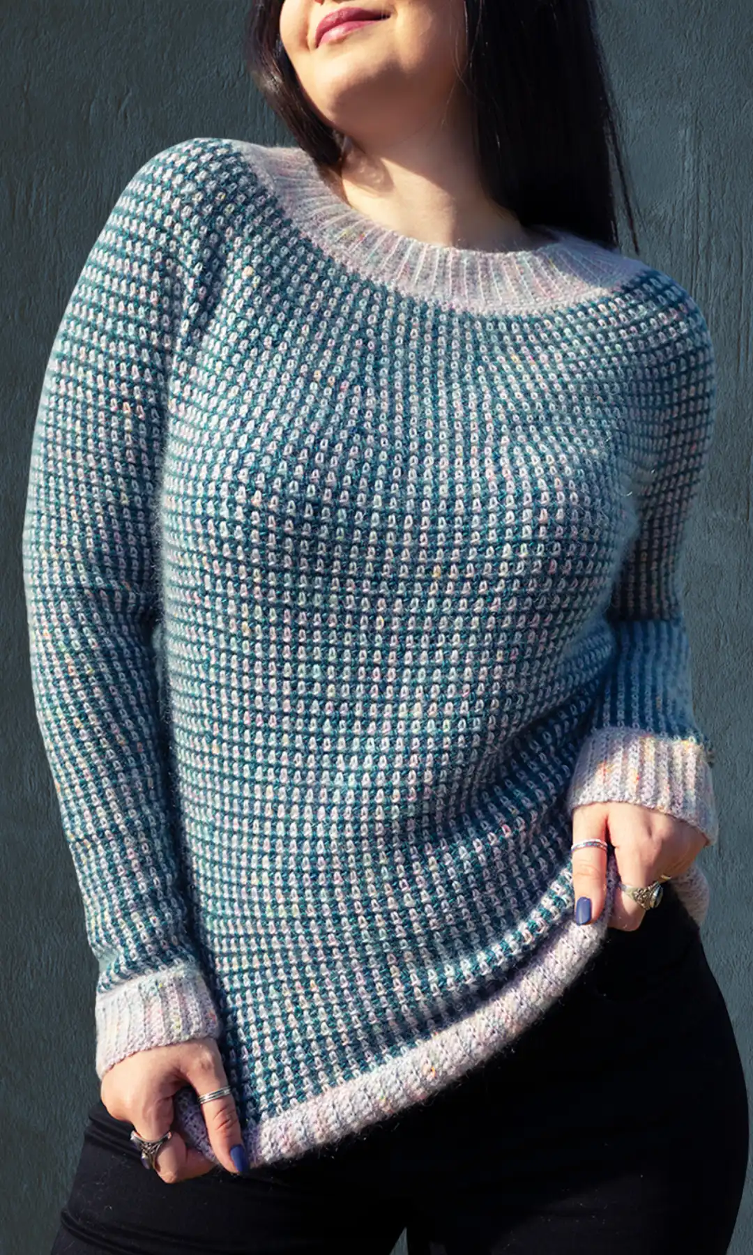 Always working with one single color at a time, this sweater is accessible to makers of a wide range of skill levels. The easy-to-execute moss stitch helps you focus more on sweater construction and provides an enjoyable and meditative crocheting experience, all the while producing a garment that looks like you really put in an effort!