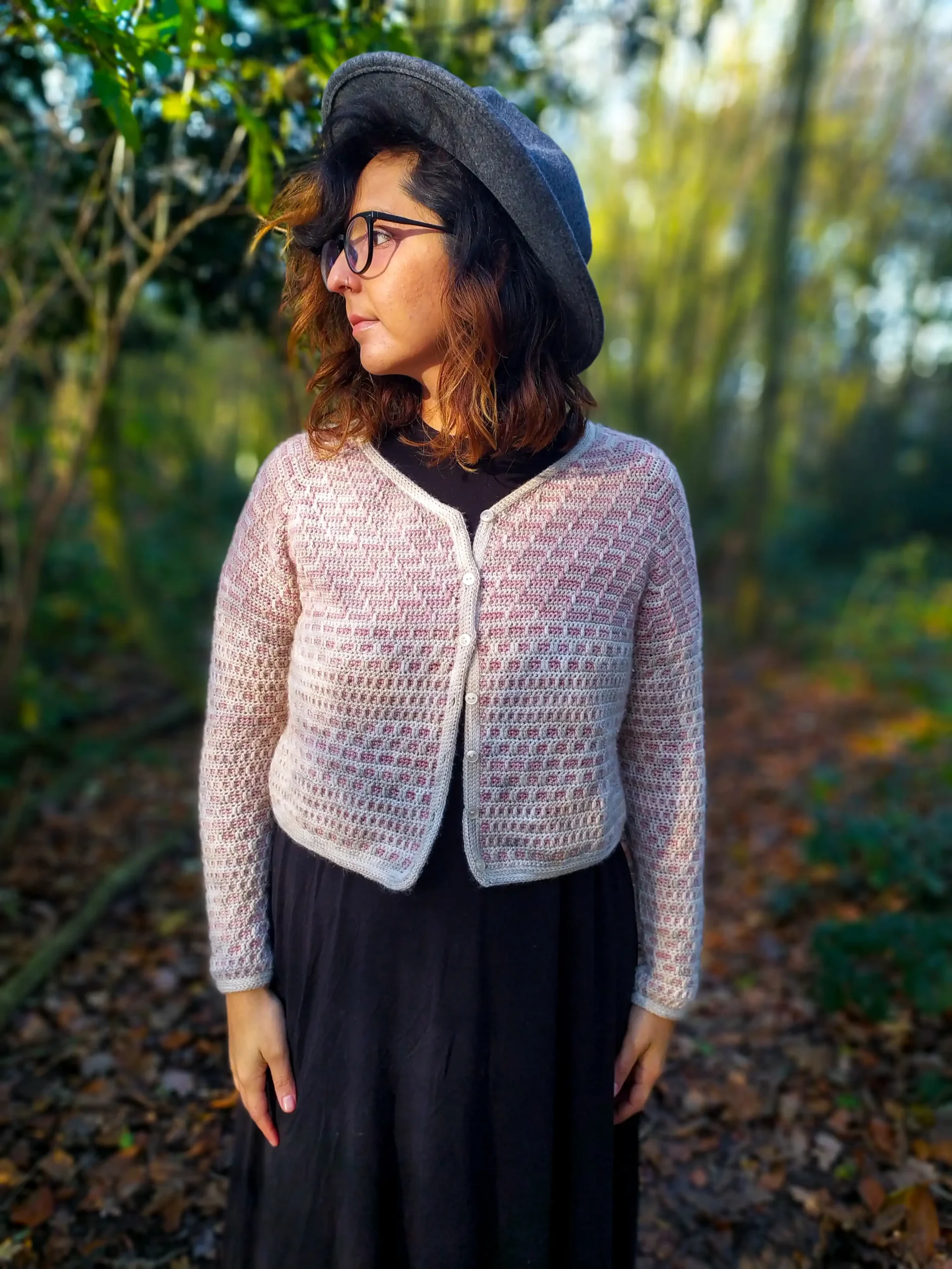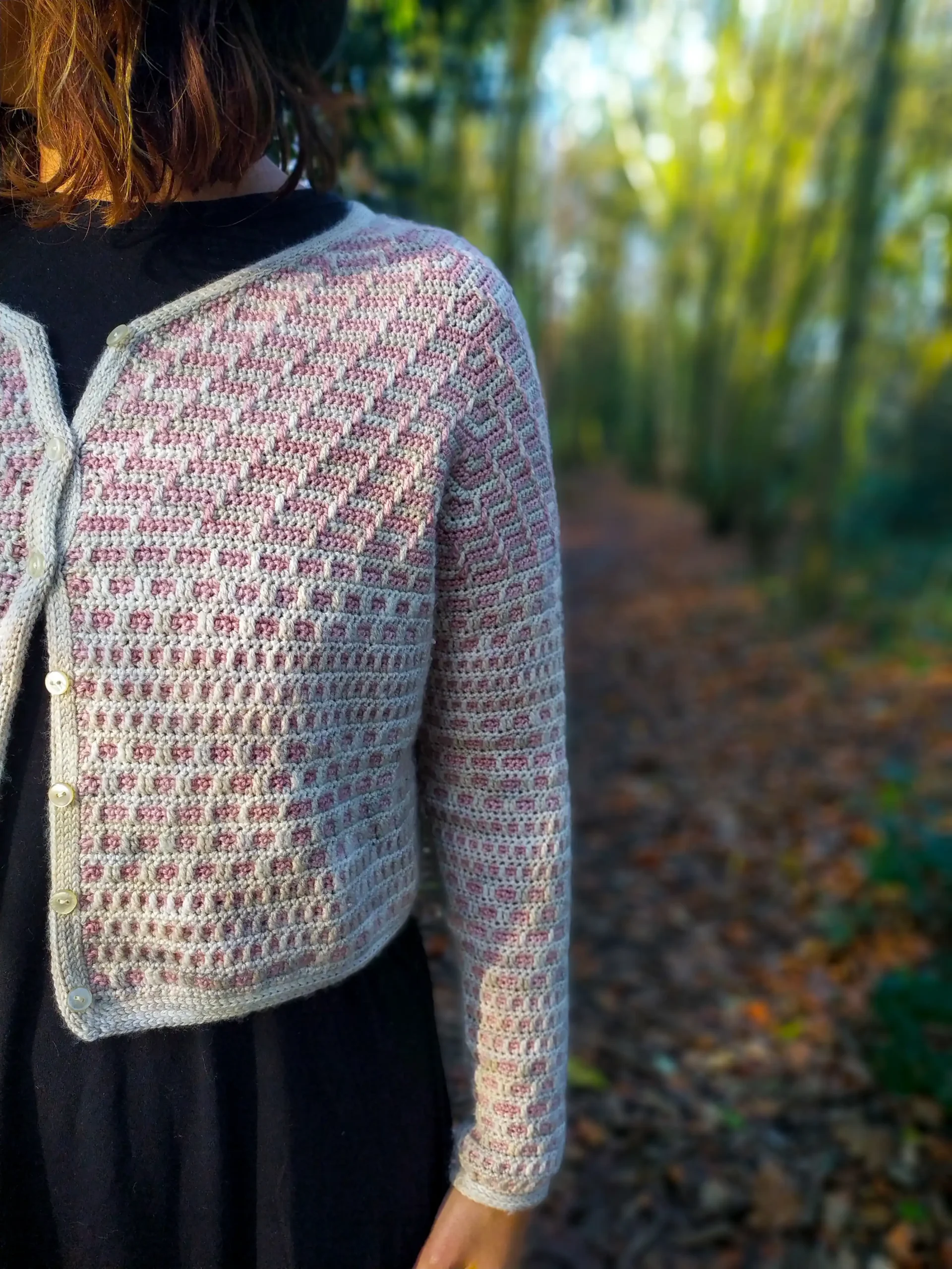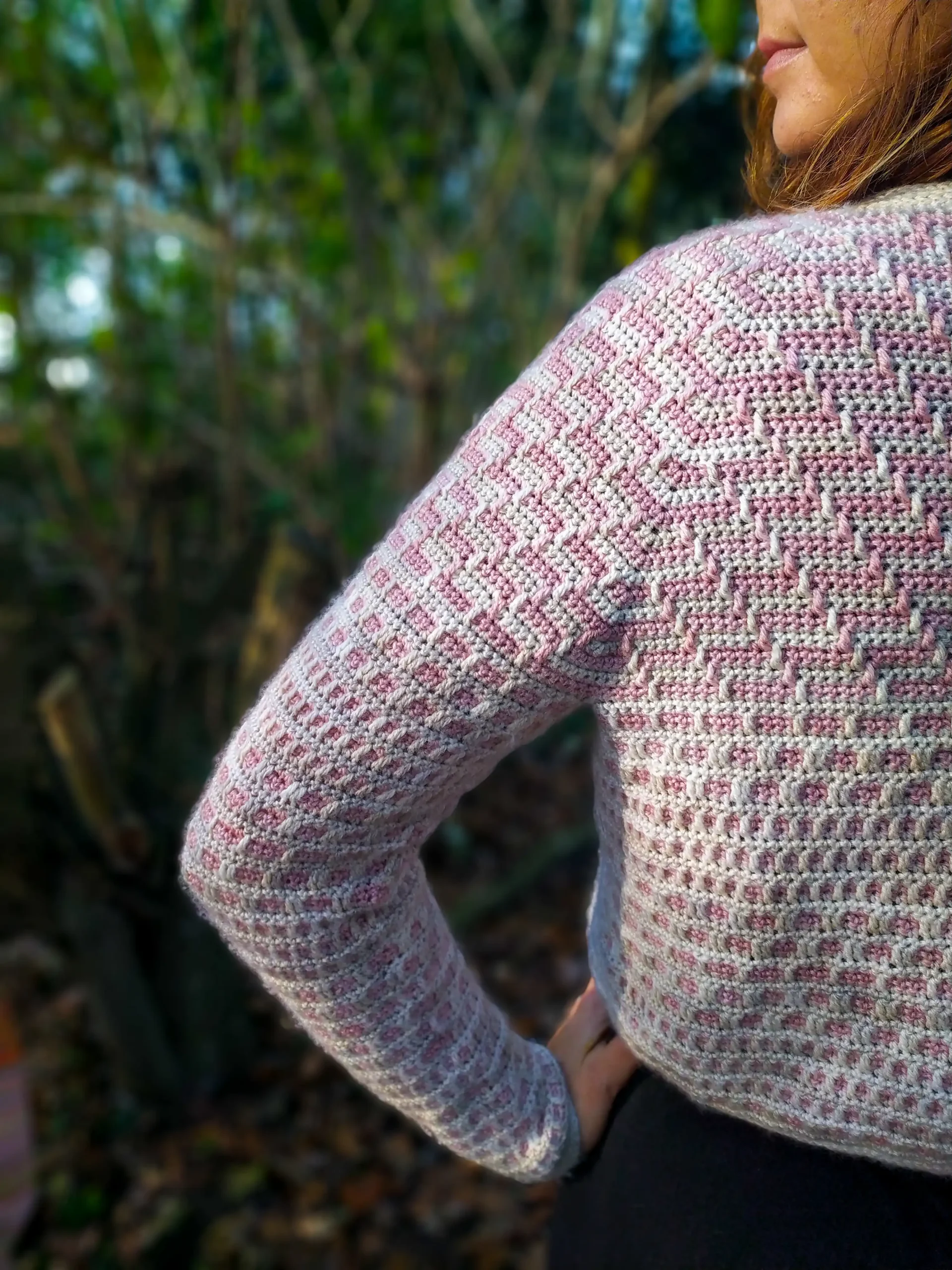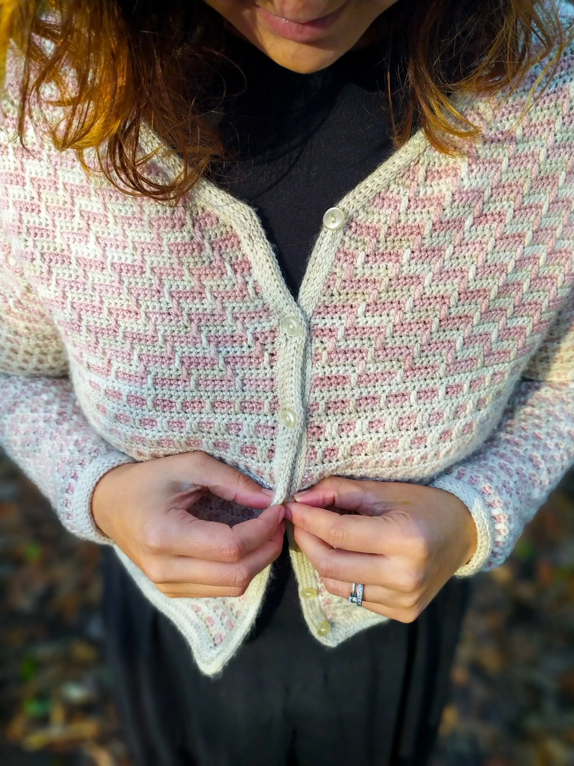 Kitzbuhel ˈkɪtsbyːl is a small alpine town in the middle of the Austrian Alps known for its skiing and mountain scenery. During Spring, when the snow is almost gone from the mountains and the sun sets, the snow glows in many colors against the dark forest and the lights from the town twinkle in the air. It’s truly a magical sight and it’s the inspiration behind the Kitzbuhel cardigan and its pullover counterpart. It is a top-down raglan style cardigan, completely seamless, worked fully in Standard Mosaic Crochet. It’s an entertaining project that allows you to play with color but with a rhythmic repetitive pattern that is easy to memorize.