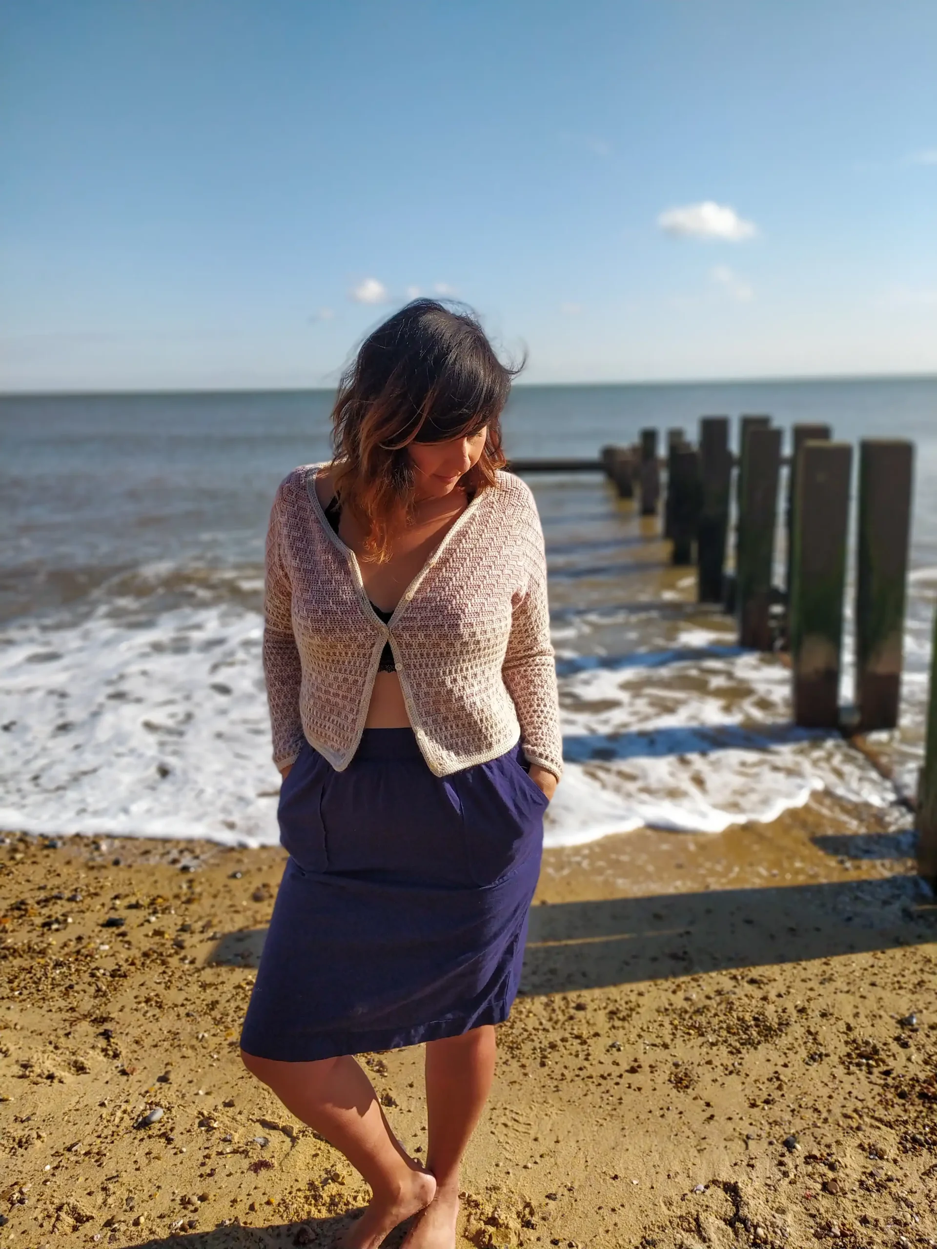This pattern comes in 9 different sizes – XS (S, M, L, XL, XXL, 3XL, 4XL, 5XL). Finished garment measurements at bust are 73.5 (83.5, 94, 104, 114.3, 124.5, 134.5, 144.5, 155) to be worn with -5 to +5 cm of positive ease.