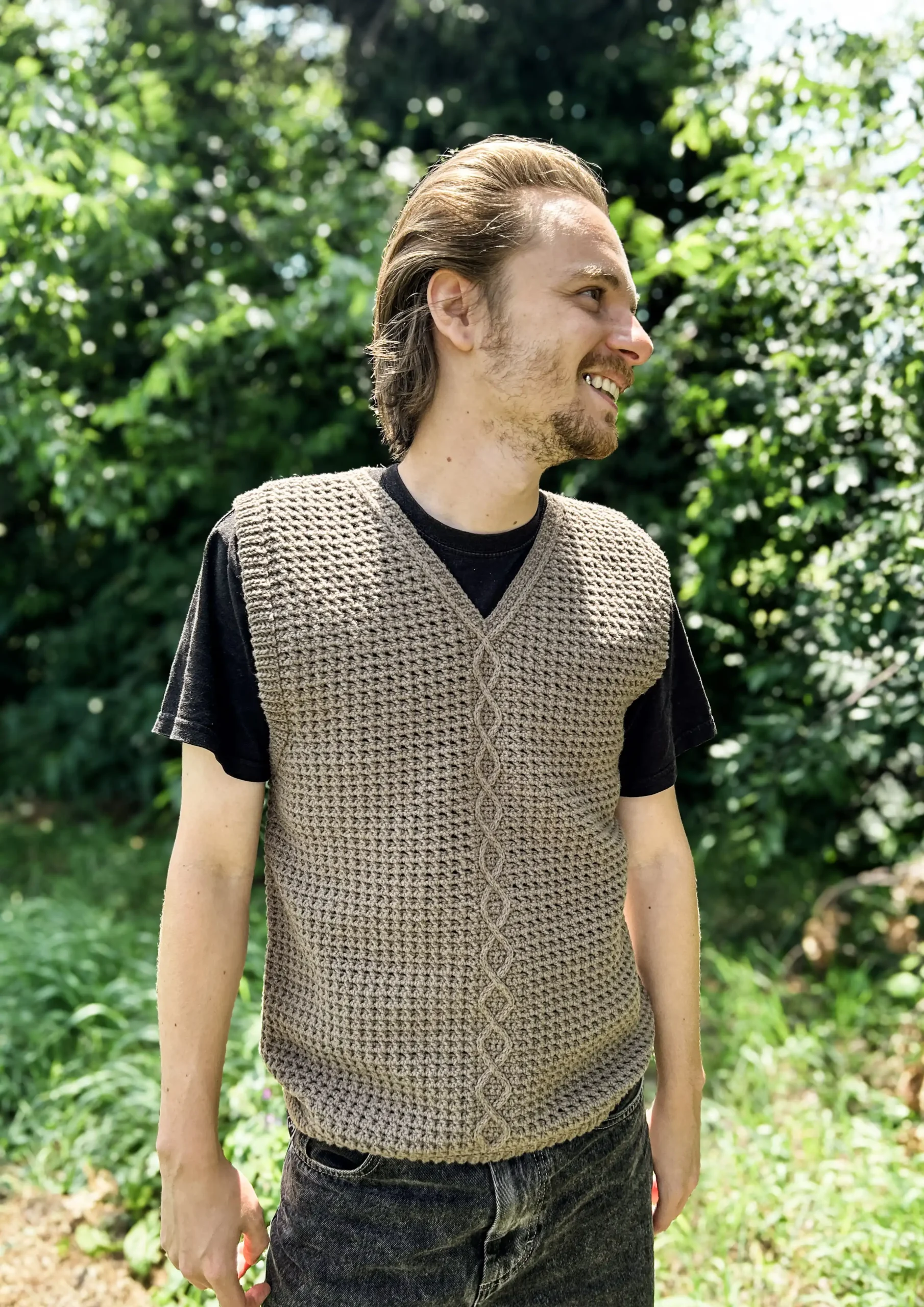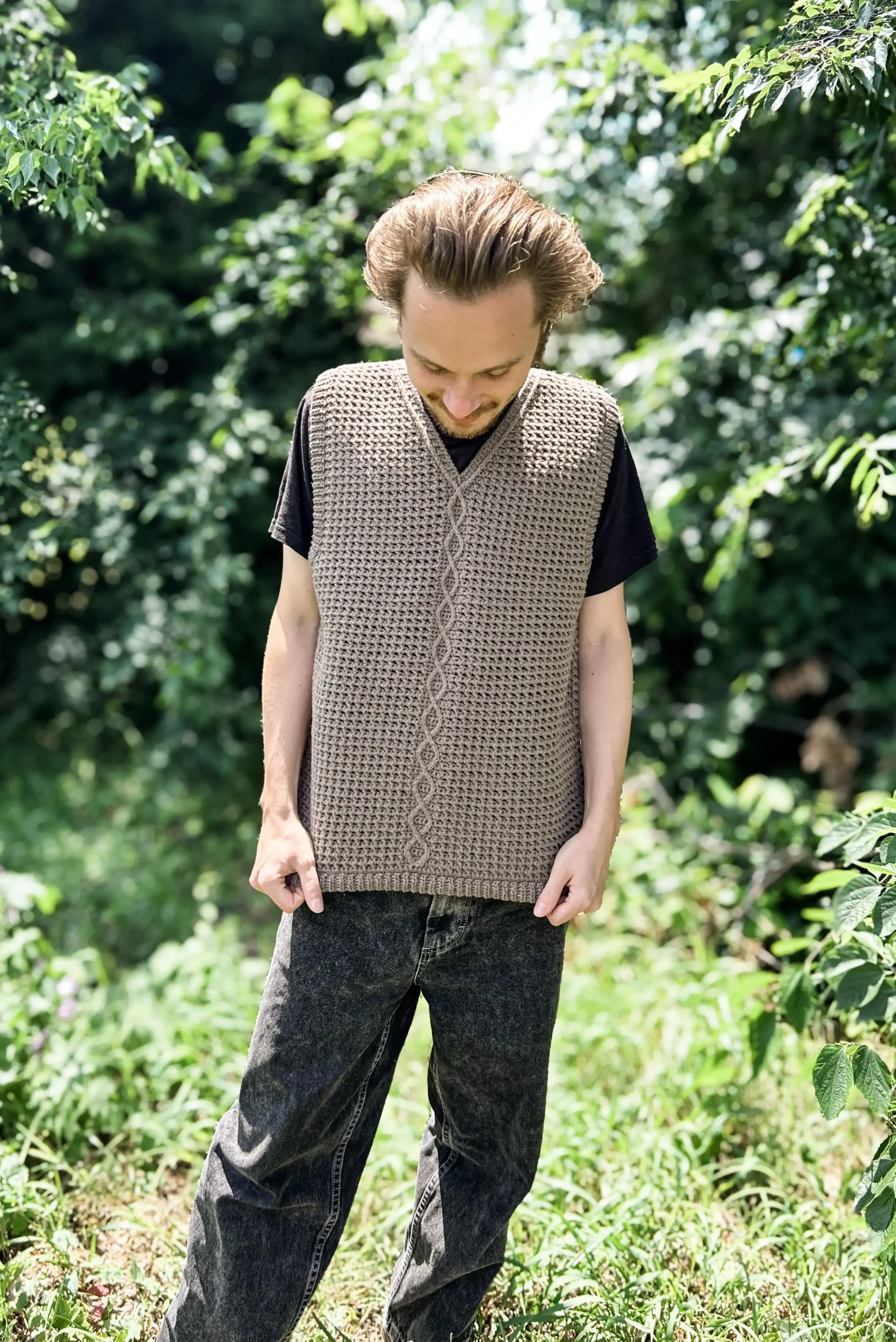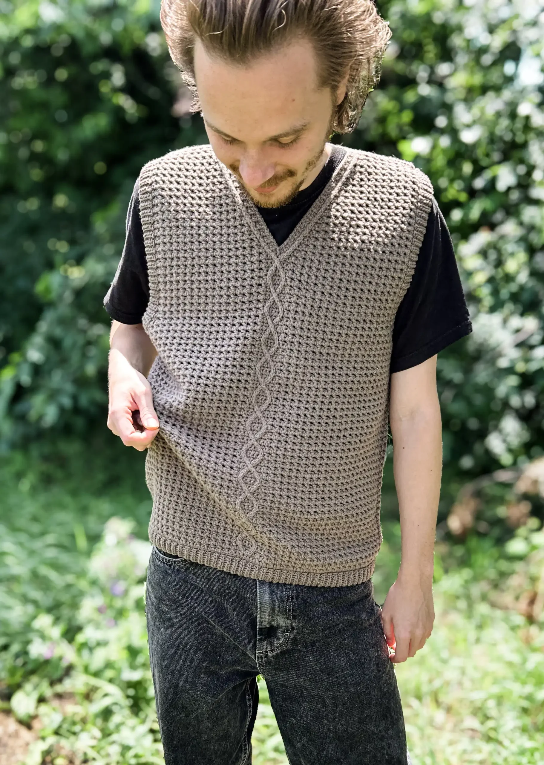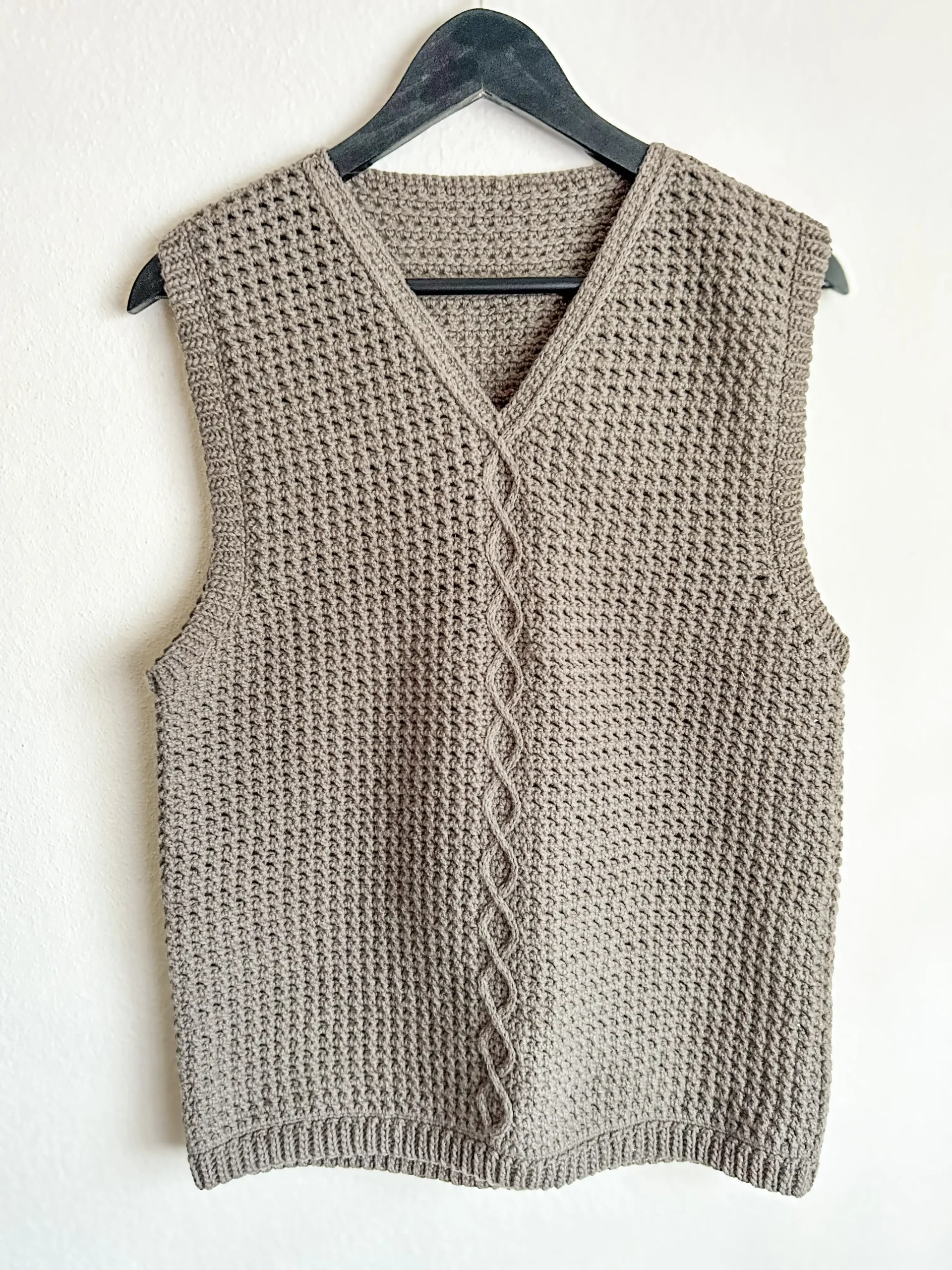 This crochet vest is designed for style and comfort, offering a relaxed fit through the body with a fitted shoulder width. The front and back panels are worked flat and seamed together, with armhole shaping for a flattering fit. A central cable section adds texture and visual interest, while the design allows for easy customization in length to suit your personal style.