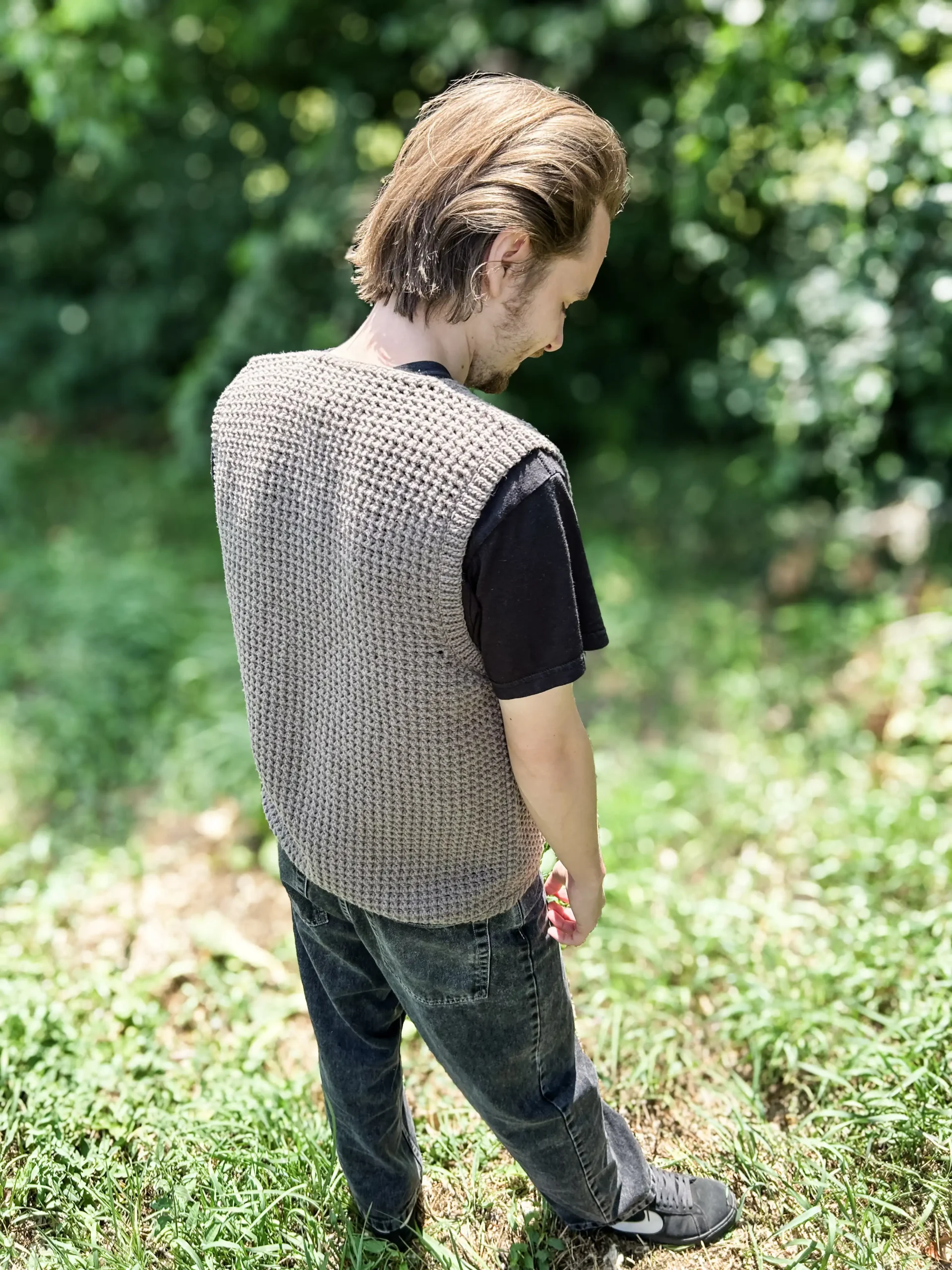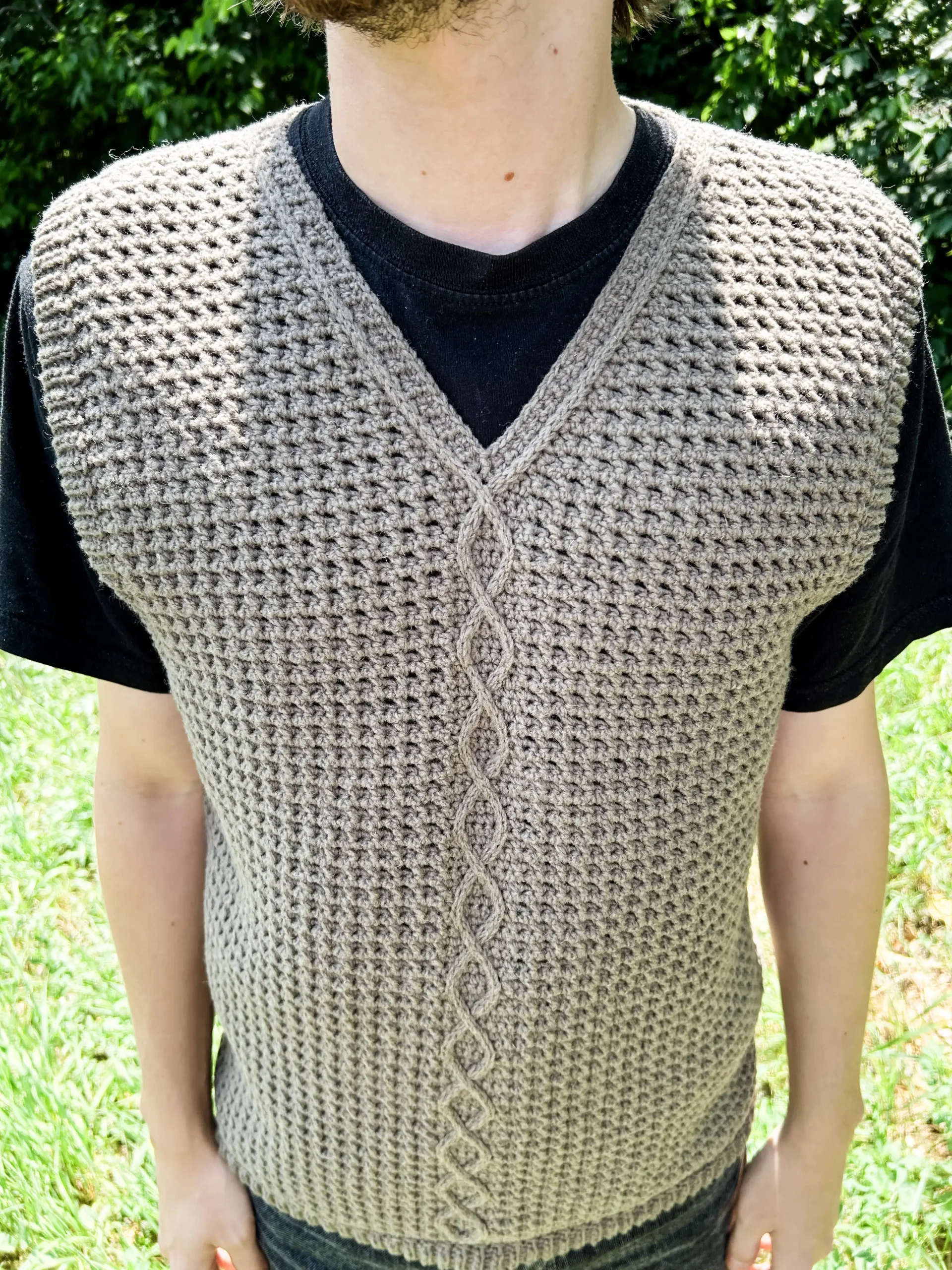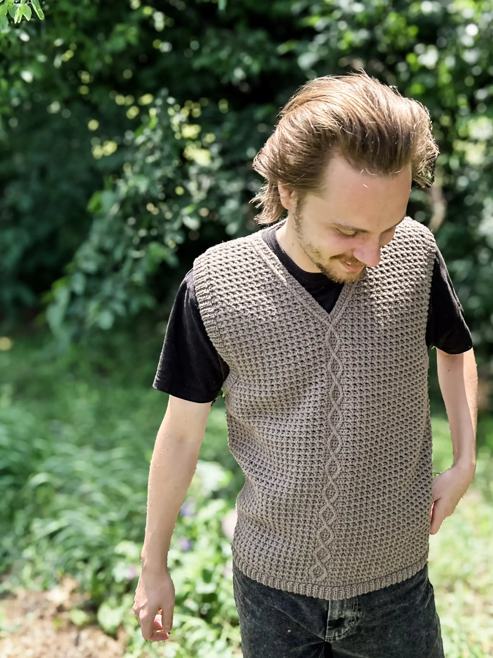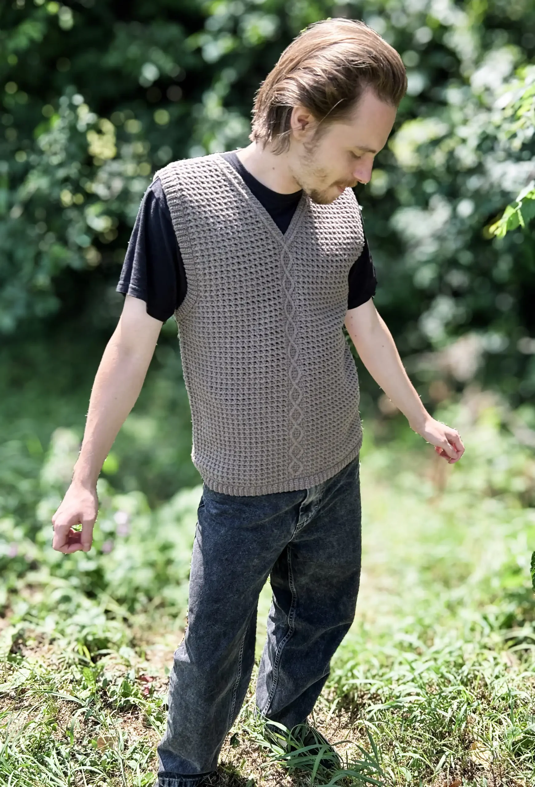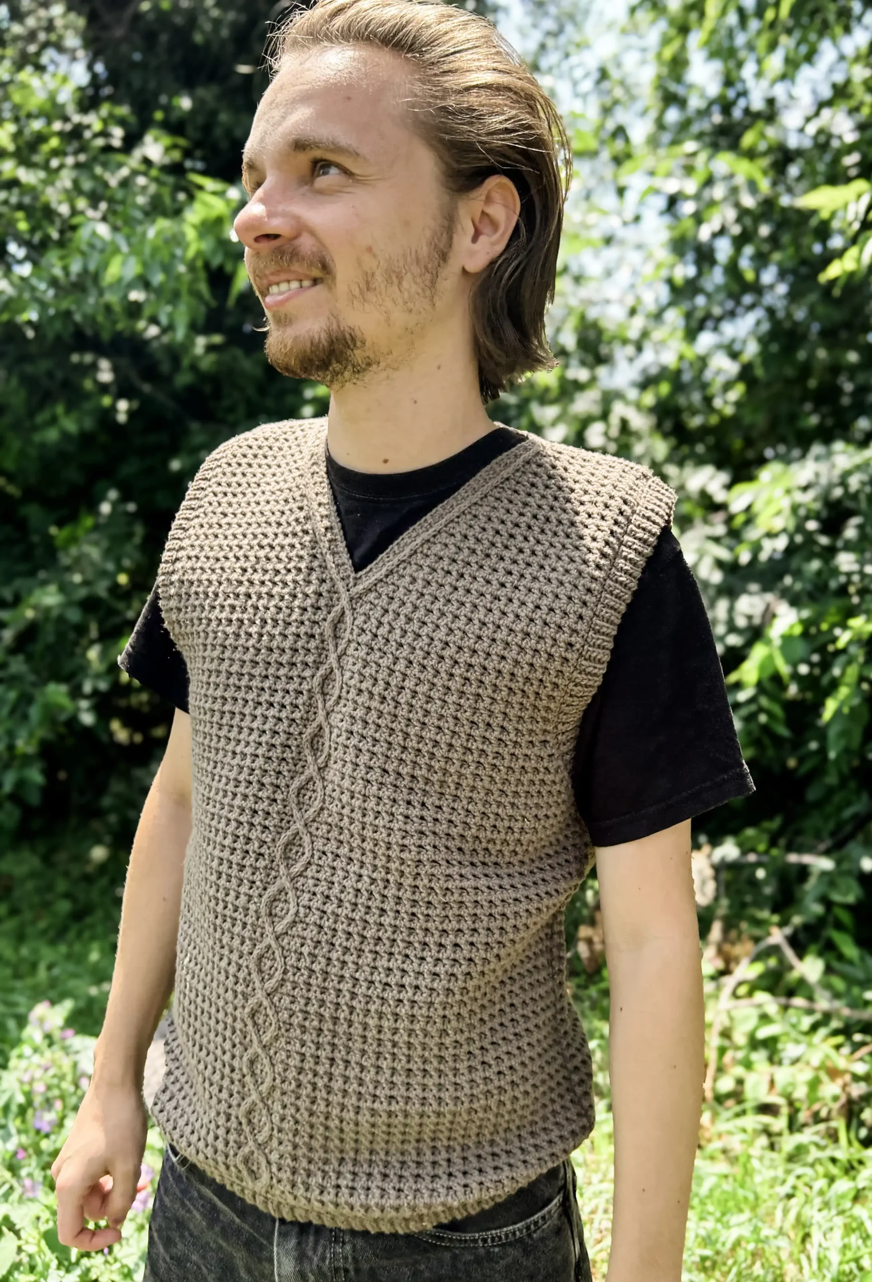 This crochet vest is designed for style and comfort, offering a relaxed fit through the body with a fitted shoulder width. The front and back panels are worked flat and seamed together, with armhole shaping for a flattering fit. A central cable section adds texture and visual interest, while the design allows for easy customization in length to suit your personal style.