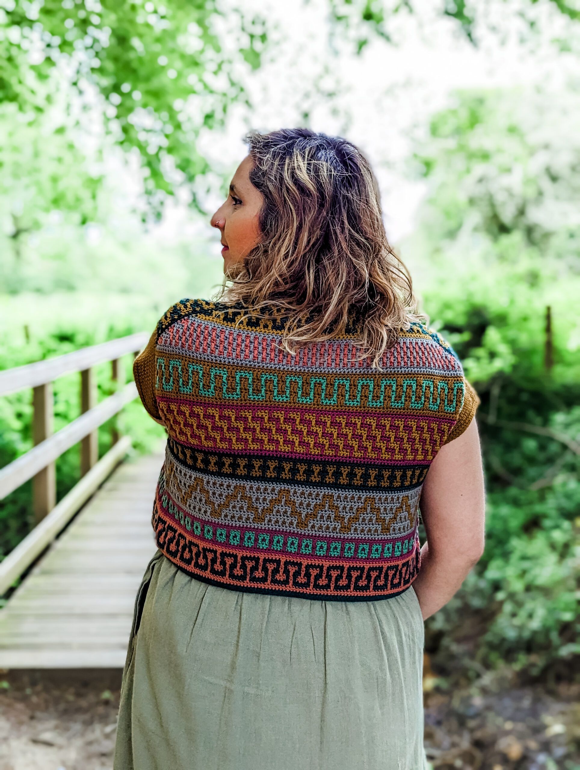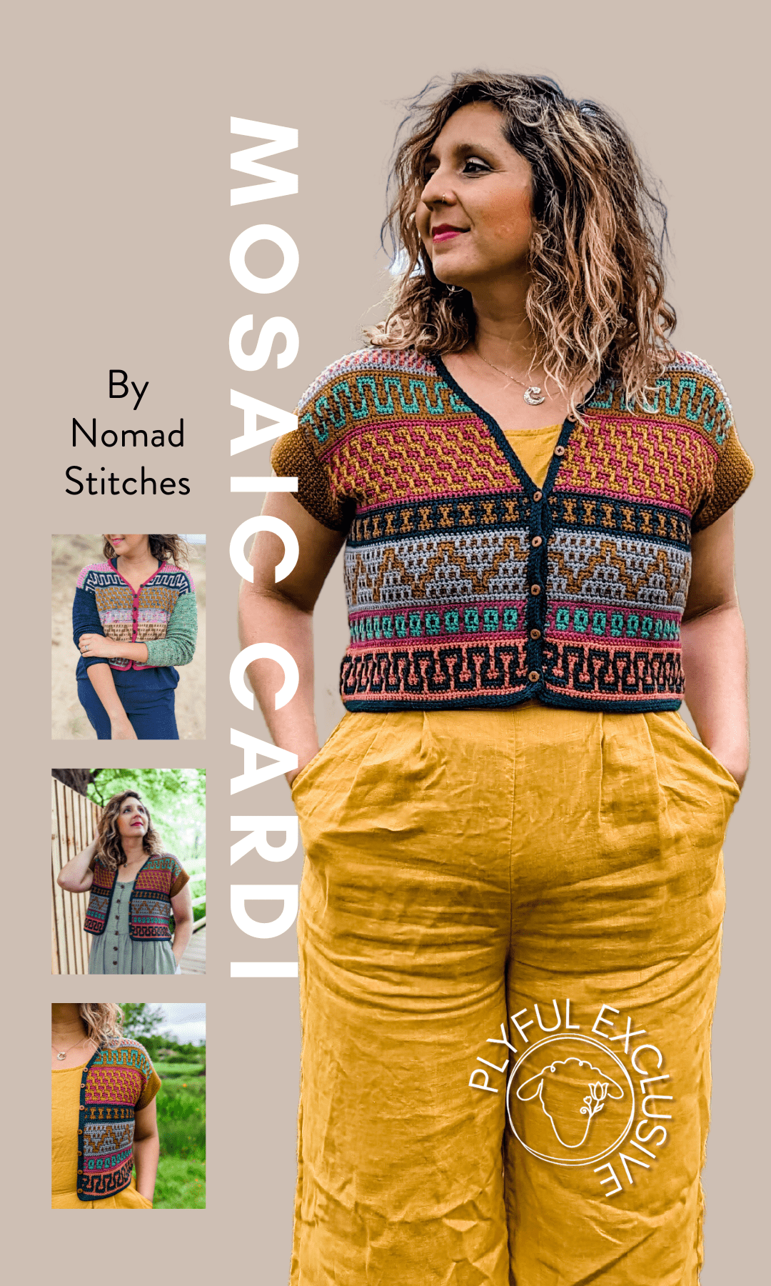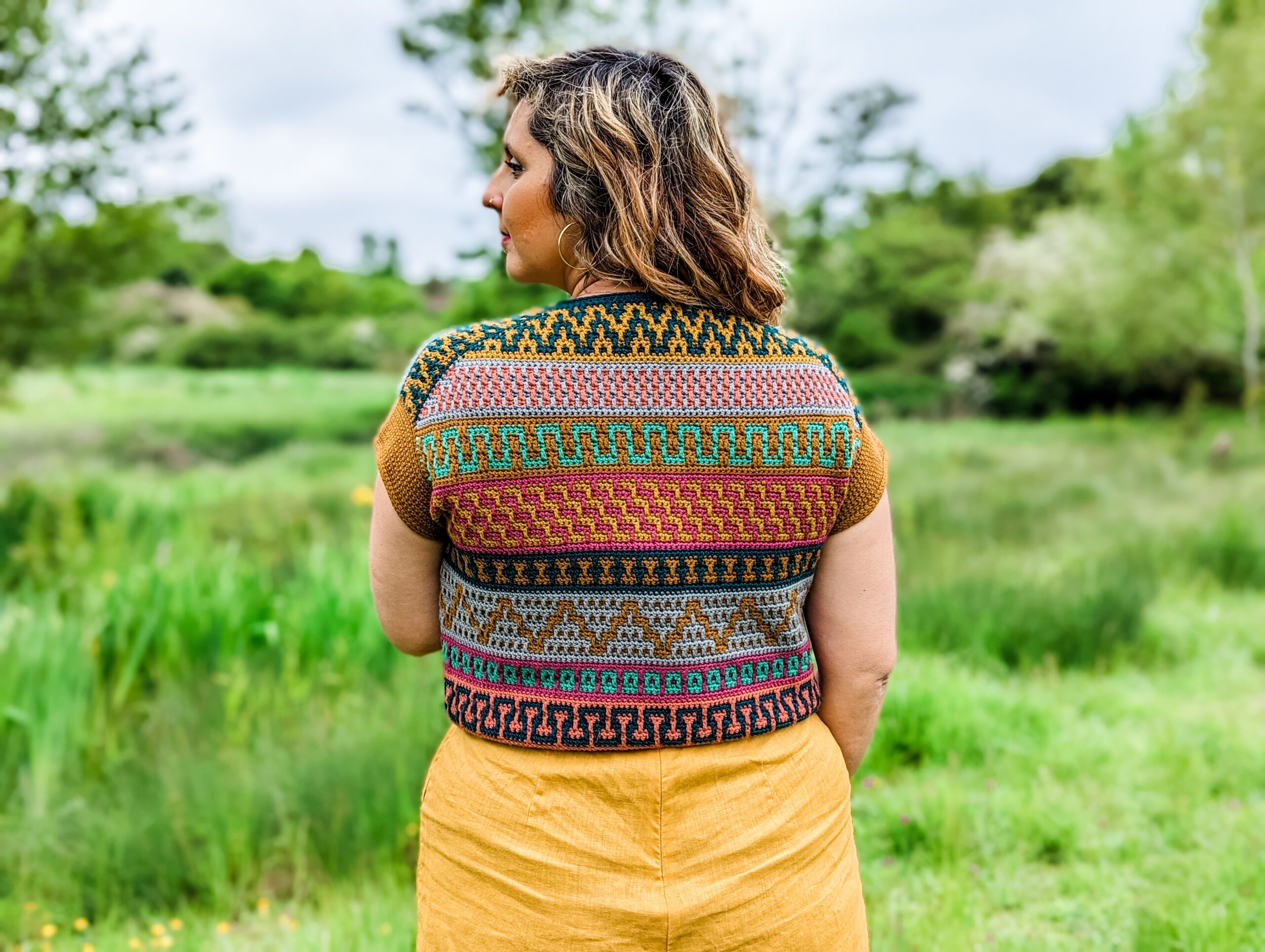 The Mosaic Cardigan is a celebration of nature at its best – inspired by flower meadows that lie dormant in winter only to burst out in color with the arrival of Spring. With ALL of the colors and fun mosaic graphics, it’s the perfect garment to use up yarn in your stash, to experiment and have lots of fun with color. It is worked top-down completely seamlessly with a slight drop-shoulder and tapered sleeves. The body follows Standard Mosaic Crochet charts, and the pattern comes with complete video tutorials for learning all of the necessary techniques. The Mosaic Cardi is the sister pattern to the Mosaic Jumper with a few differences; the Cardigan calls for Fingering weight yarn and it uses Standard Mosaic Crochet worked flat, while the pullover calls for Sport weight yarn and is made using Single-Row Mosaic Crochet in the round. Use the coloring page at the end to plan your color scheme!