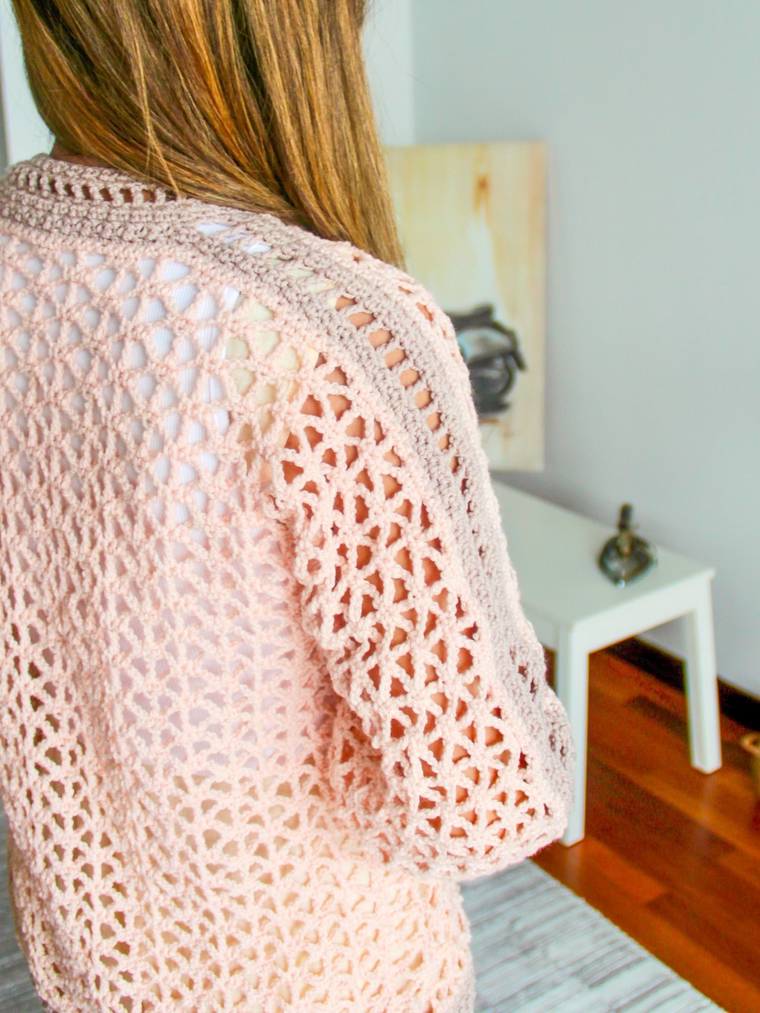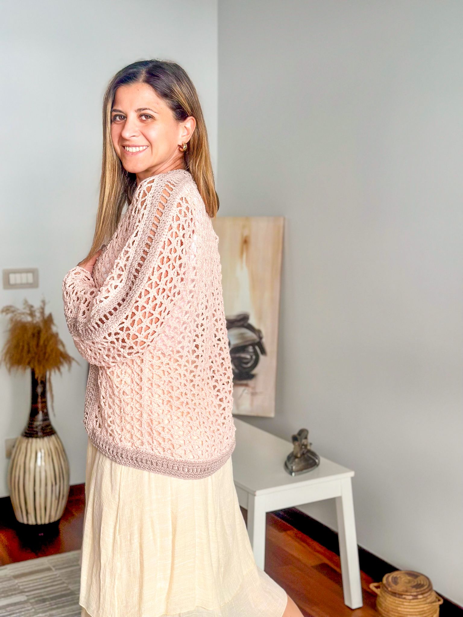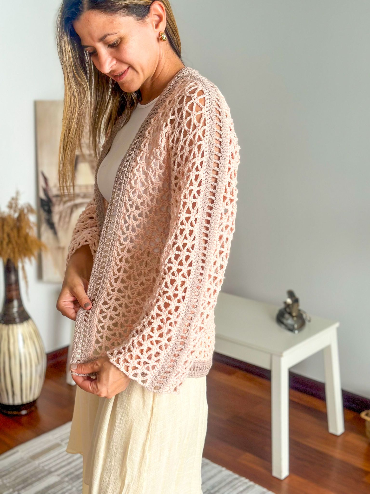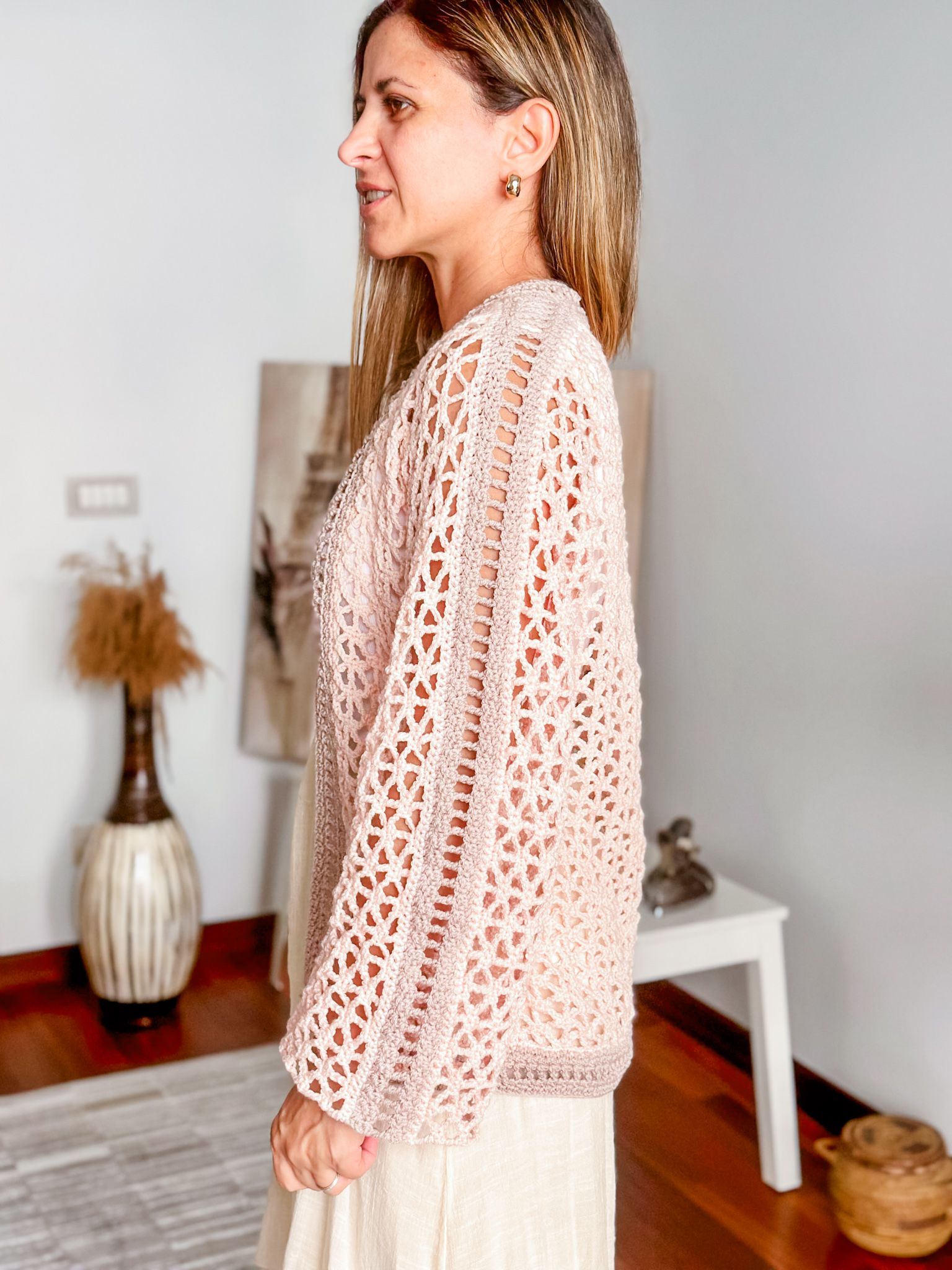 It is worked in one flat panel and joined from the sides to the sleeves. The cardigan has 2-3 cm of positive ease, so if you prefer an oversize fit, you may work one size up.