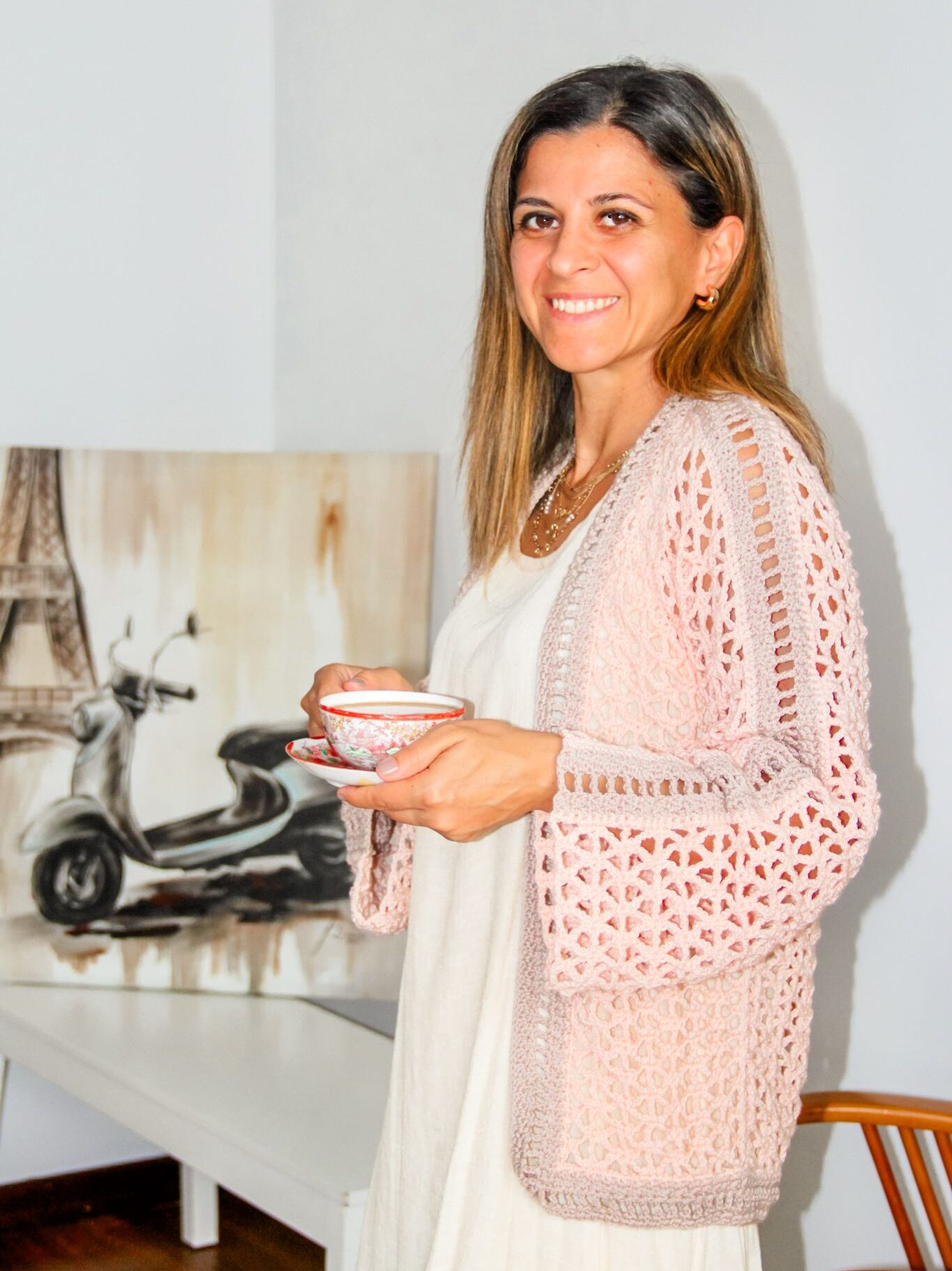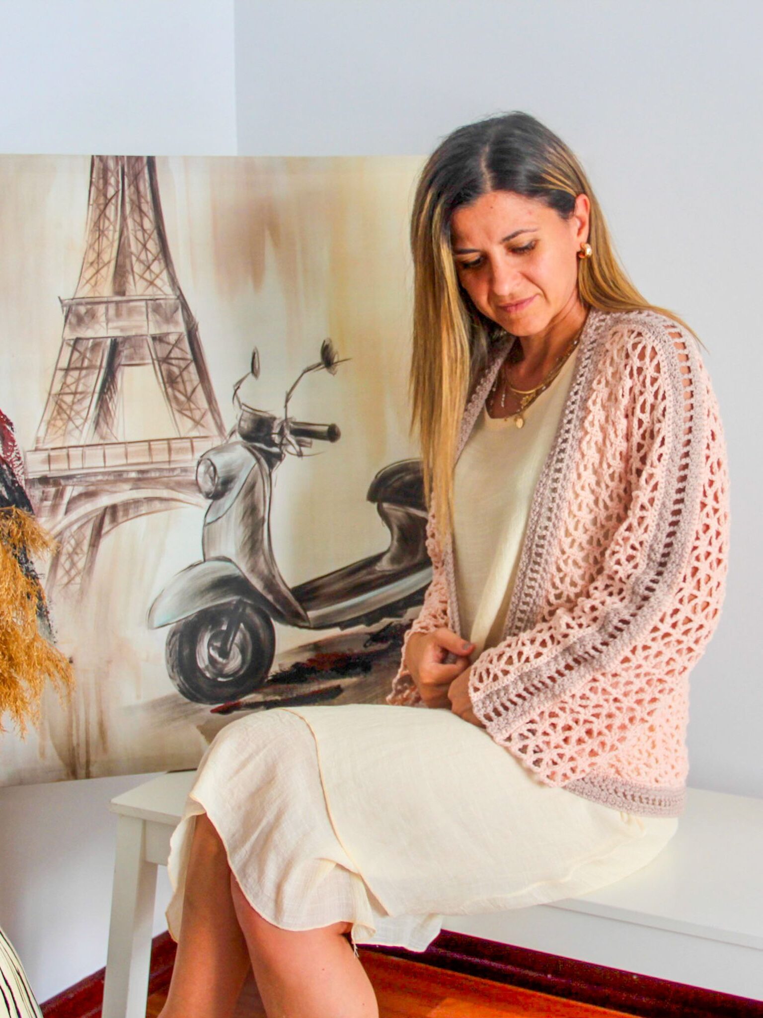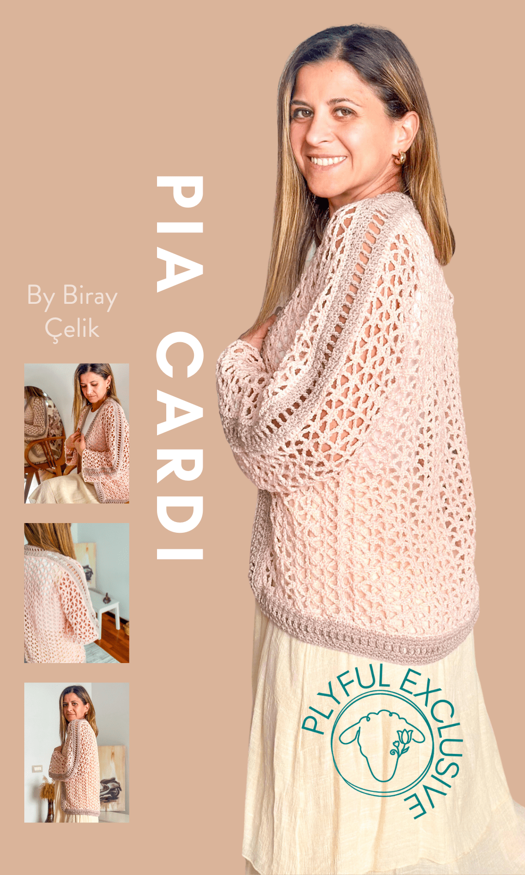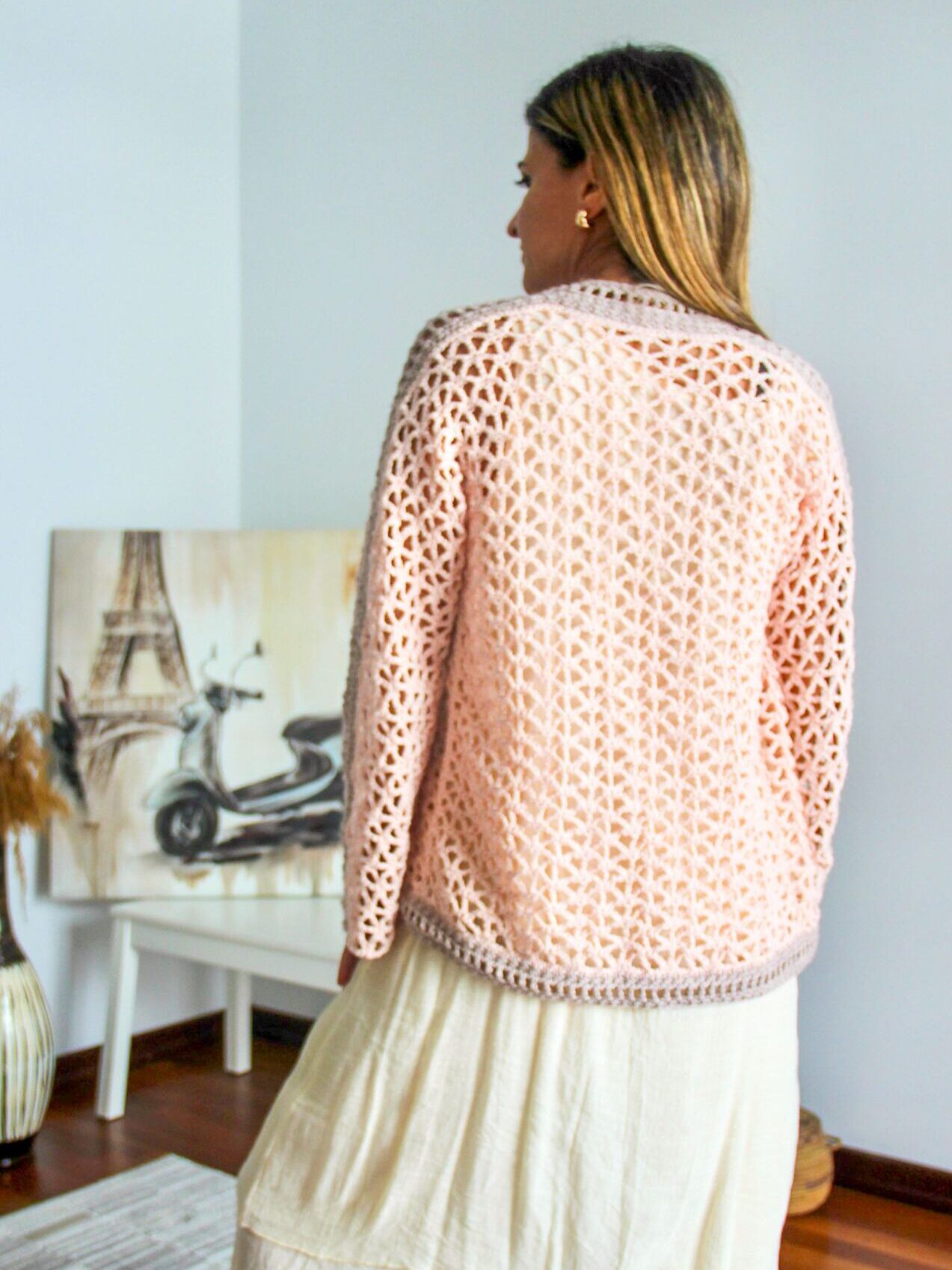 It is worked in one flat panel and joined from the sides to the sleeves. The cardigan has 2-3 cm of positive ease, so if you prefer an oversize fit, you may work one size up.