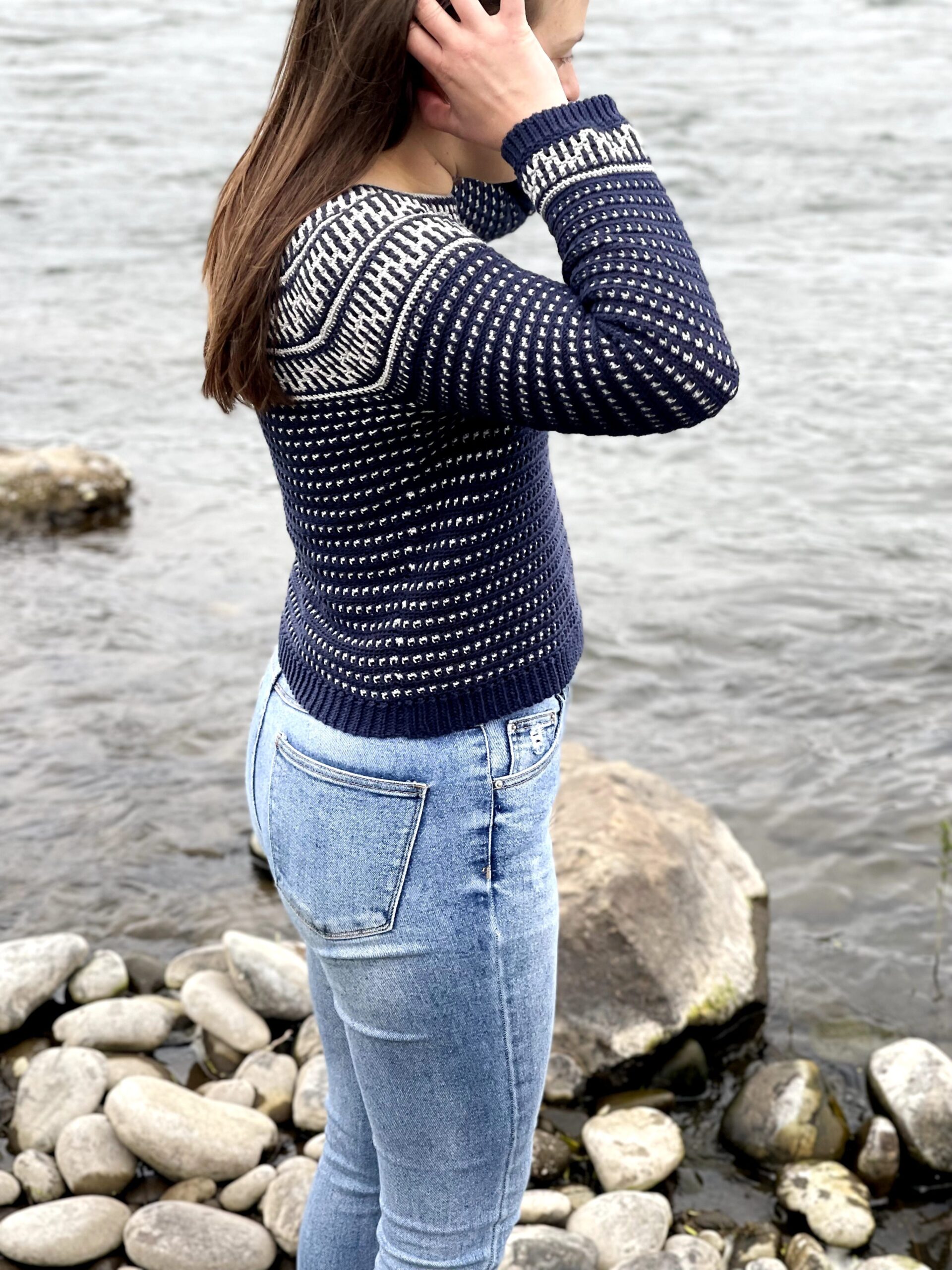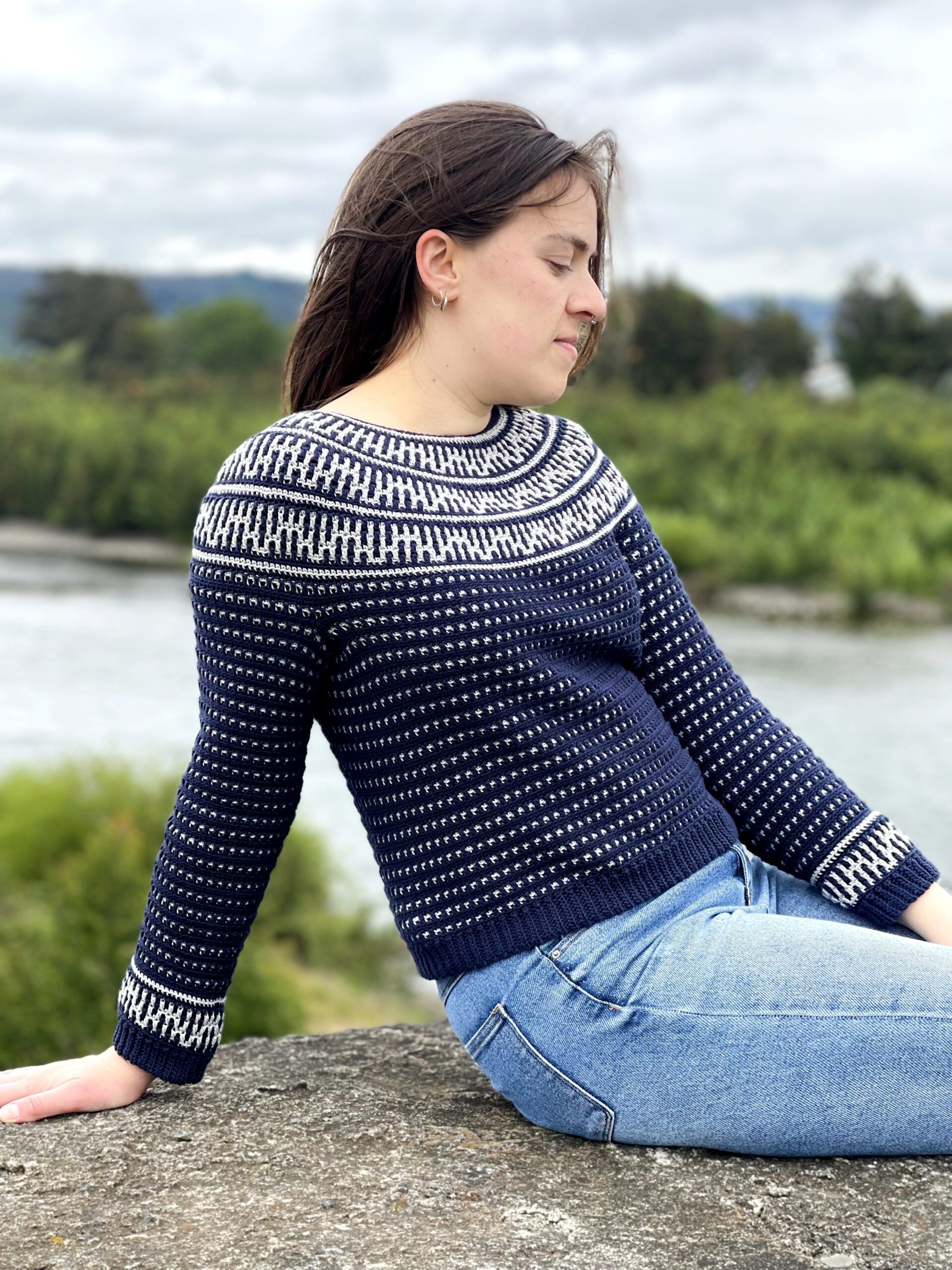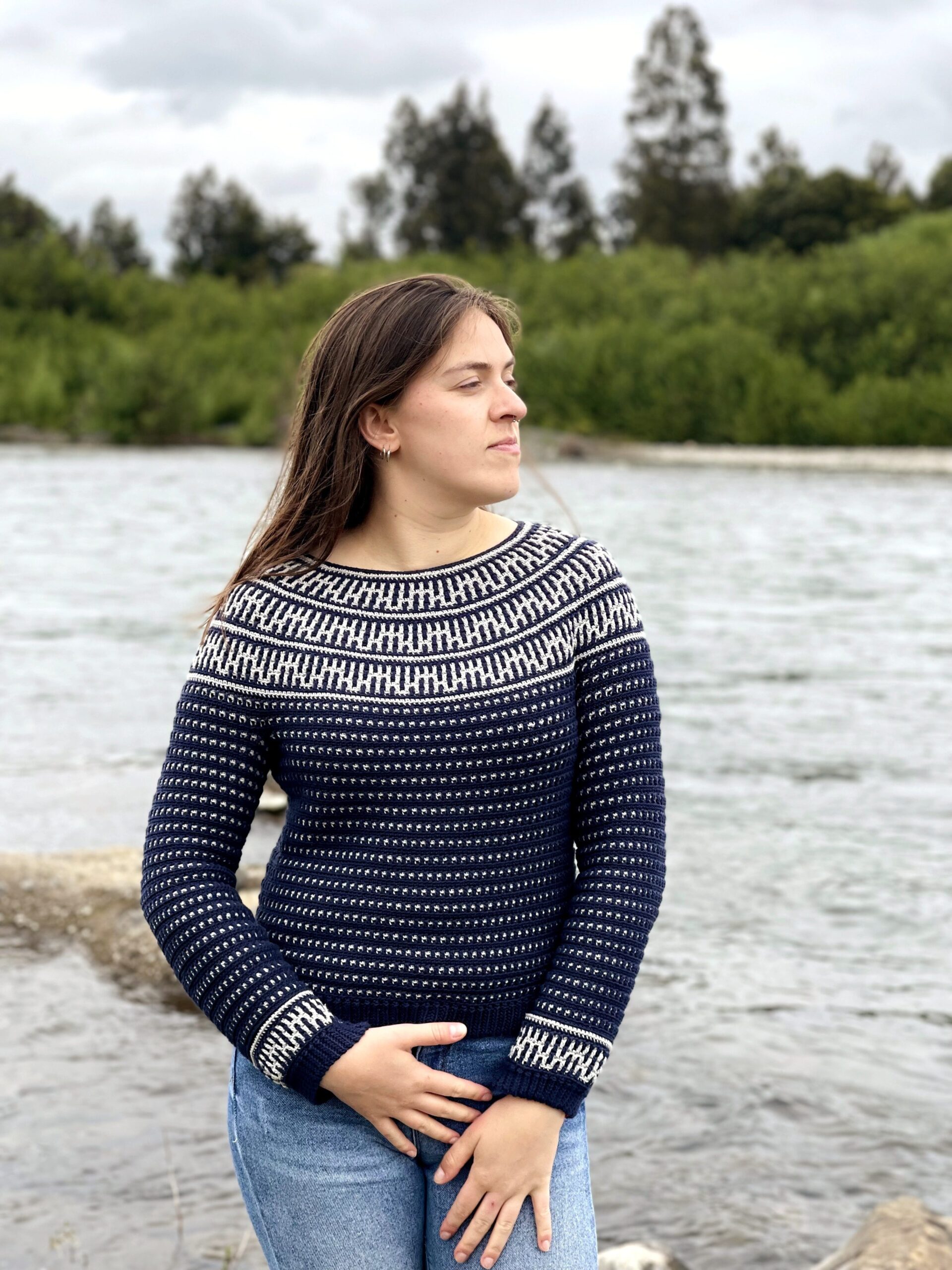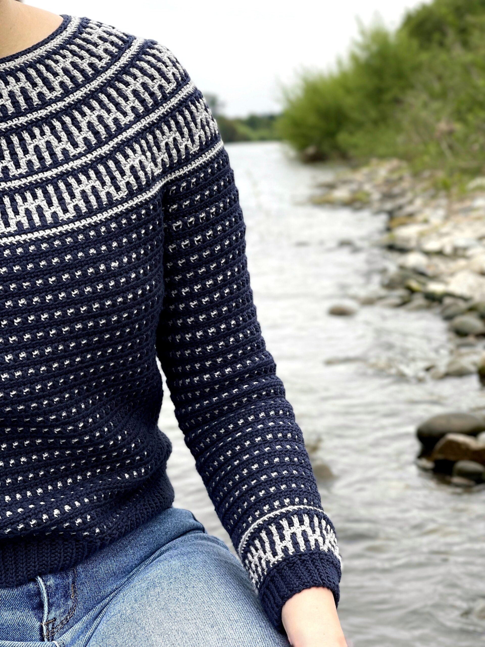 The Riverside Pullover – where style meets versatility in a seamless blend of comfort and creativity! This top-down wonder embraces the art of color with its captivating round yoke adorned in a mesmerizing mosaic motif. All colorwork is made using the Overlay Mosaic Crochet Technique (also sometimes called Single Row Mosaic Crochet). The rhythmic stitch pattern and effortless construction make each crochet session a soothing journey, ensuring you’ll find yourself returning to this project time and again.