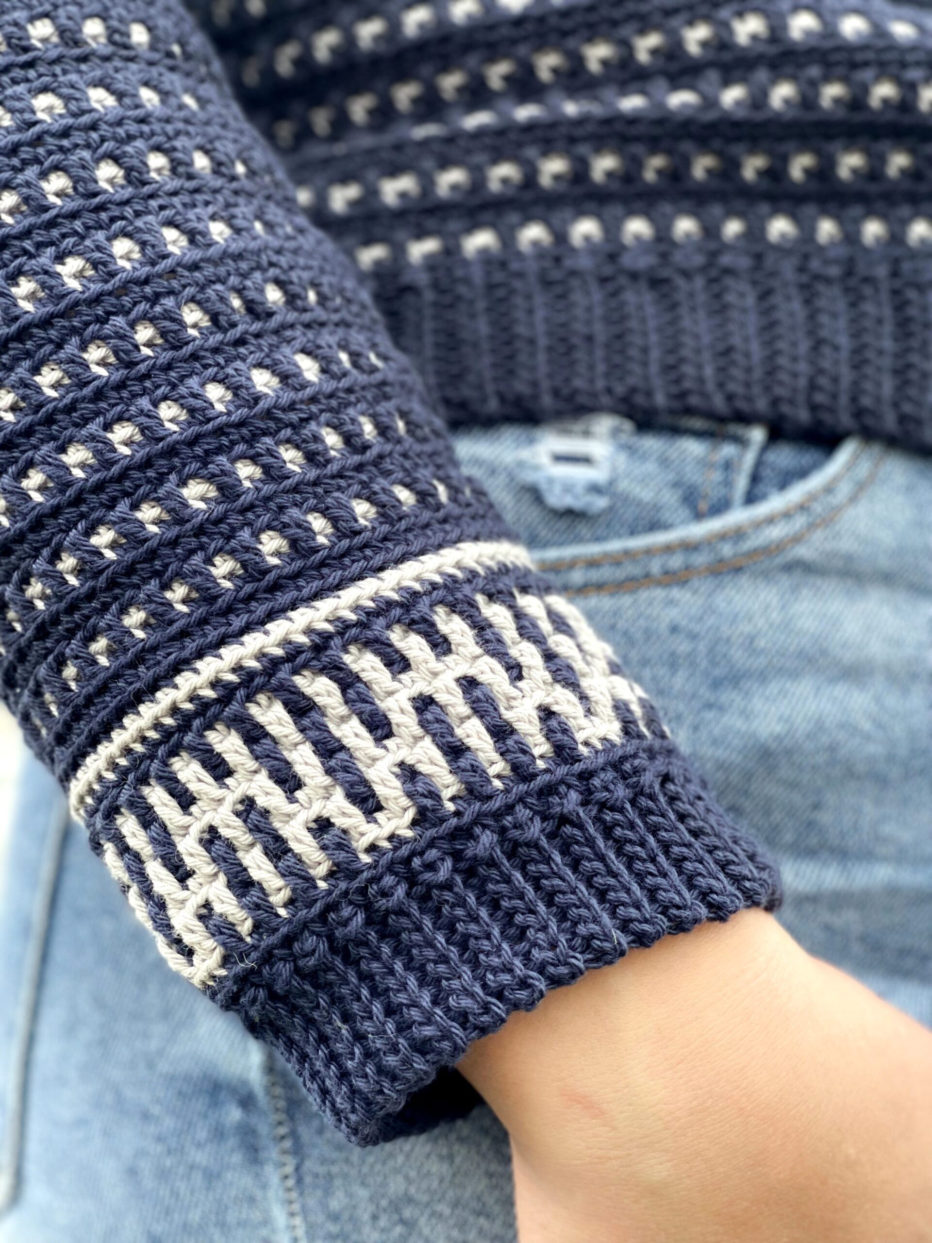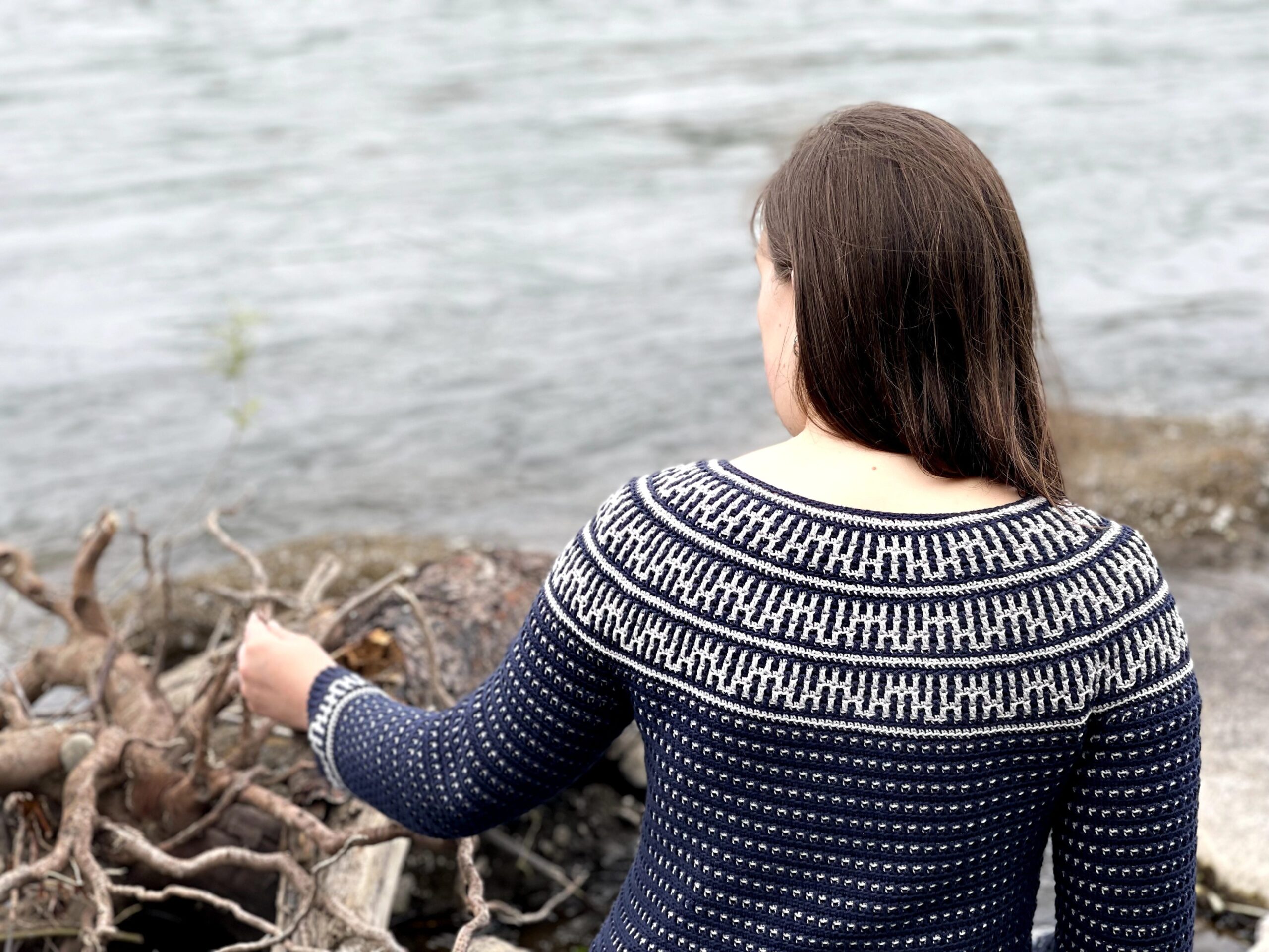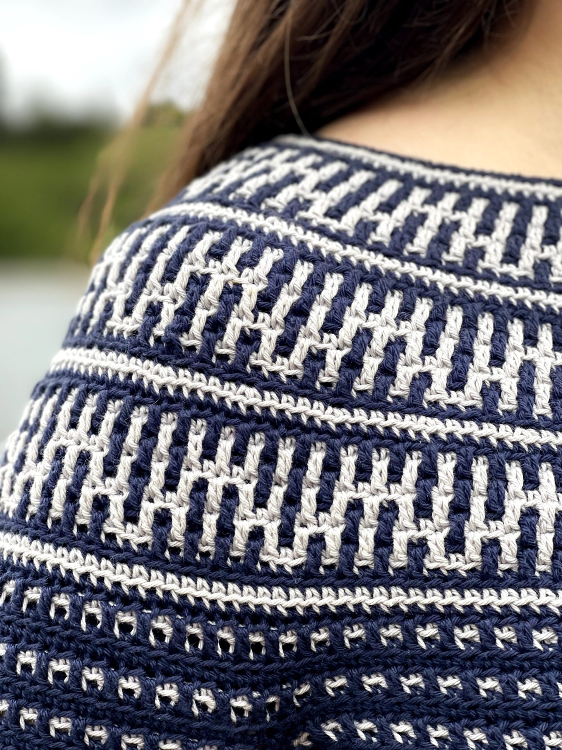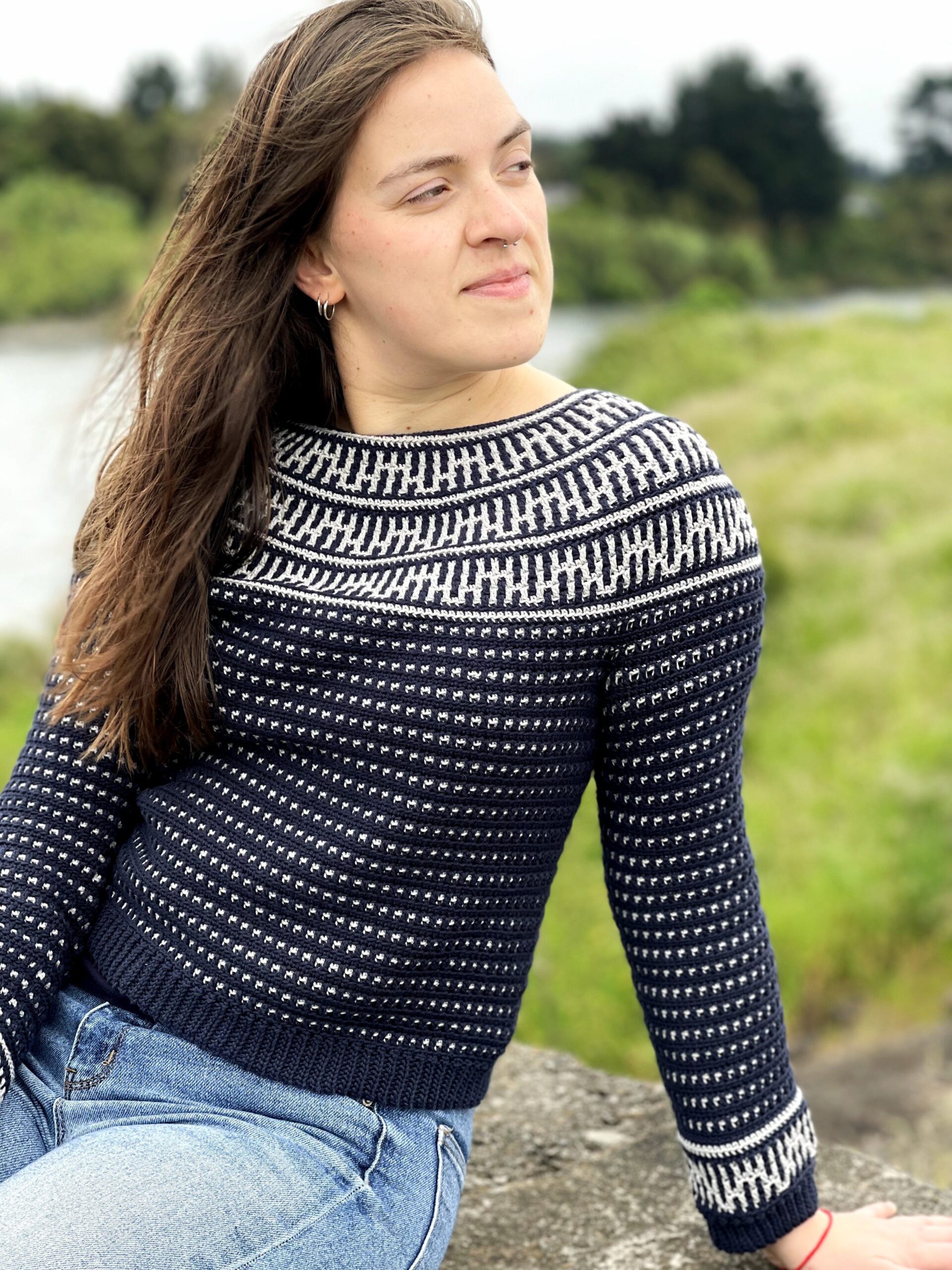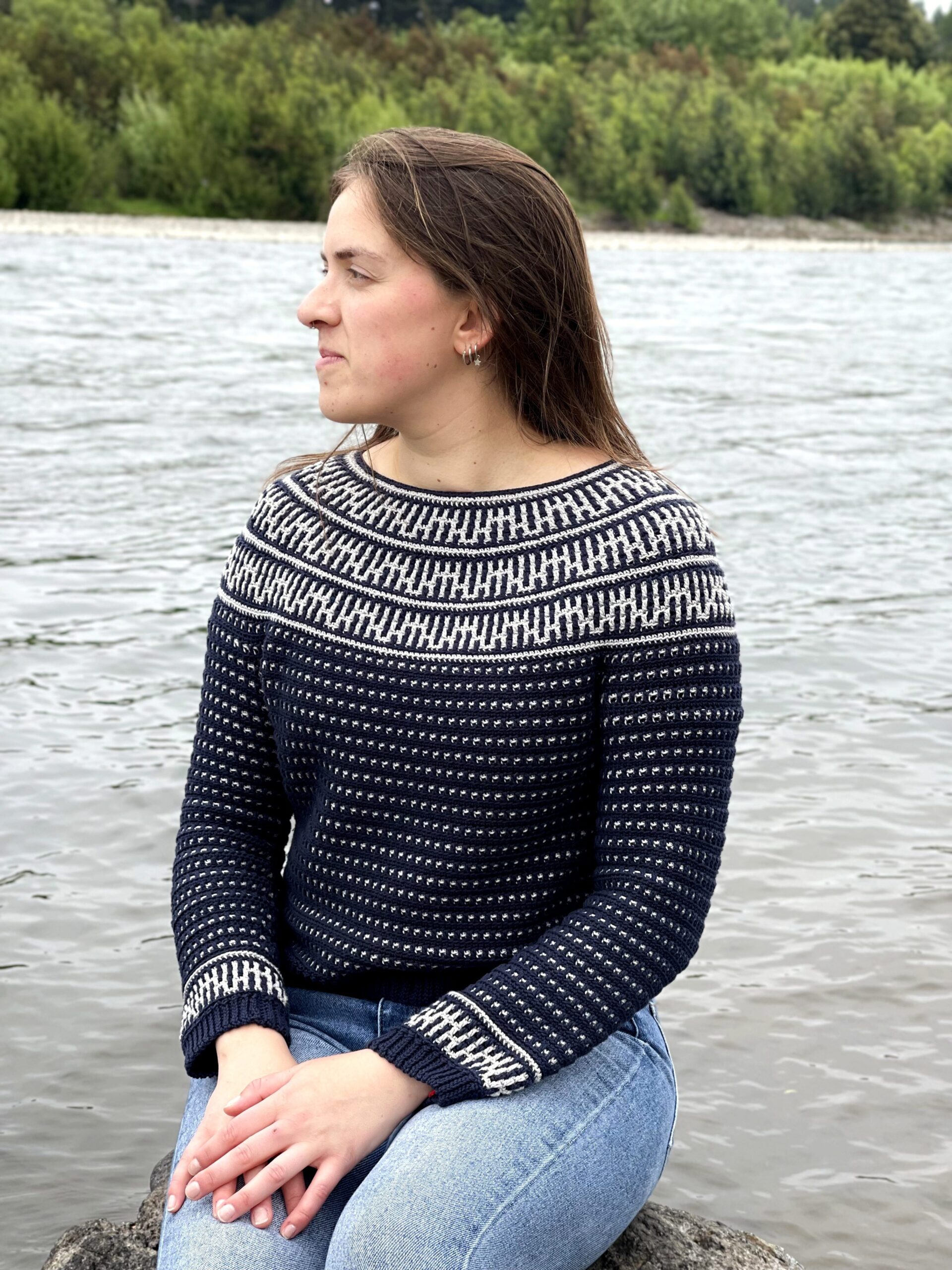 The Riverside Pullover – where style meets versatility in a seamless blend of comfort and creativity! This top-down wonder embraces the art of color with its captivating round yoke adorned in a mesmerizing mosaic motif. All colorwork is made using the Overlay Mosaic Crochet Technique (also sometimes called Single Row Mosaic Crochet). The rhythmic stitch pattern and effortless construction make each crochet session a soothing journey, ensuring you’ll find yourself returning to this project time and again.
