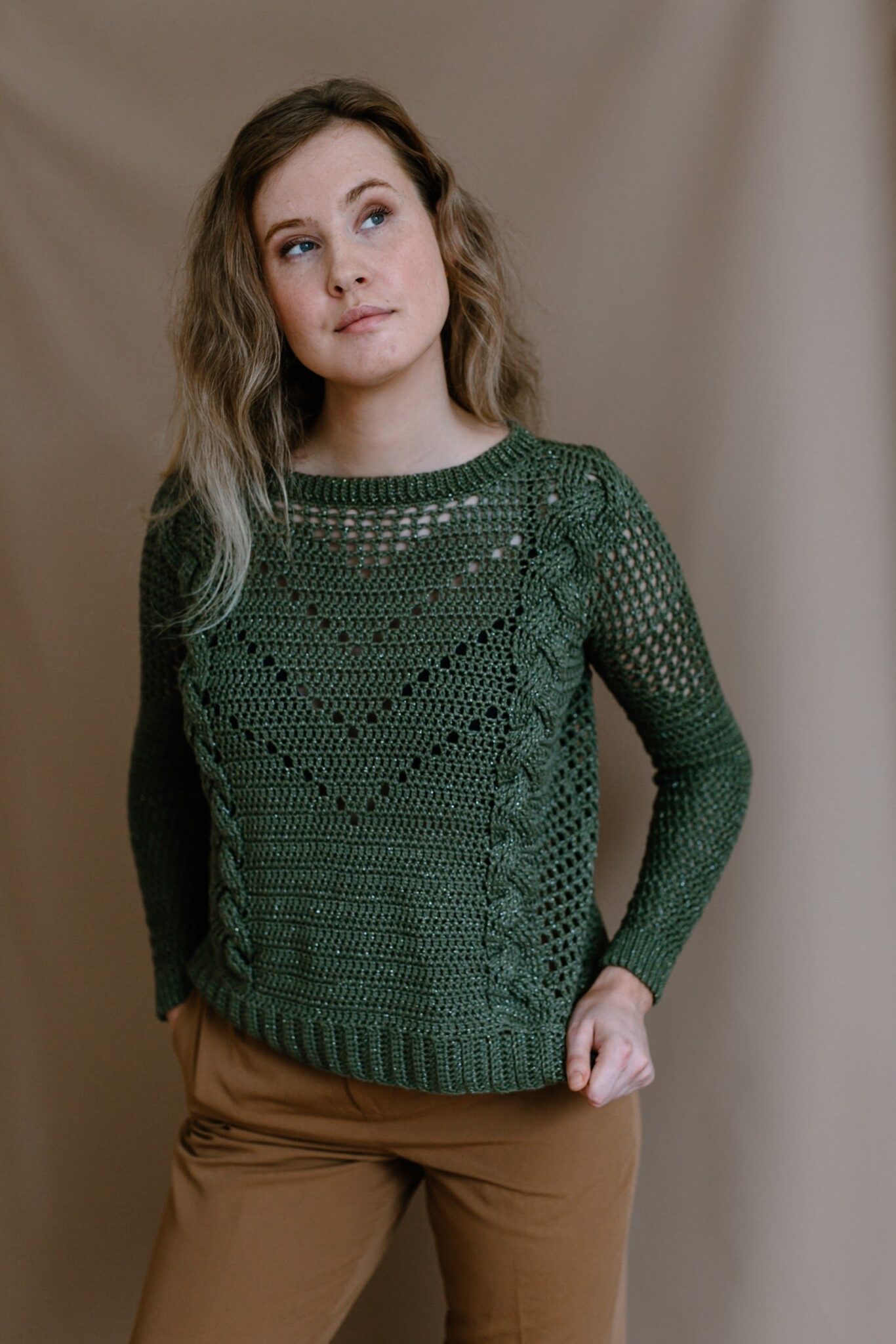 This design takes the classic concept of crochet cables and gives them a modern twist in the context of the Rudens sweater. While the design boasts an appearance of simplicity, a closer look reveals the intricate mesh segments on the sides and filet crochet “arrows” in the front, adding an extra layer of intrigue to the garment.