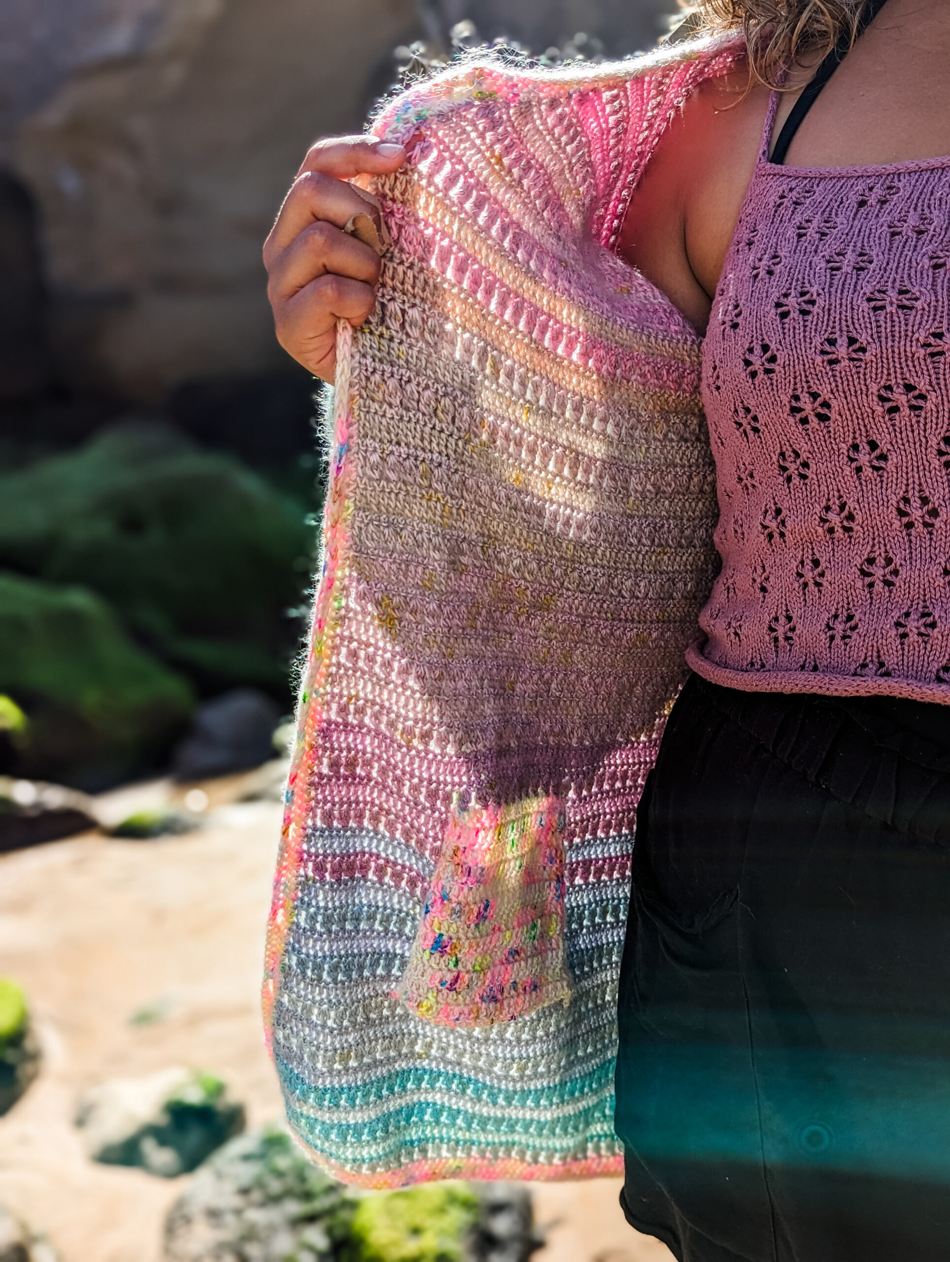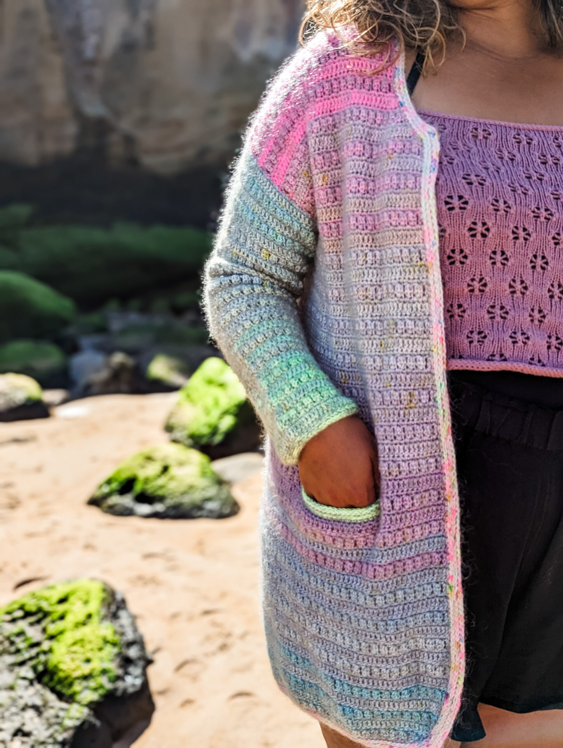 Yarn used for the Fade Hip-length sample is Botanical Yarns, 4ply Merino Sock (fingering weight, 75% superwash wool, 25% nylon, 100g, 425 m) in colors of the 2023 Advent Calendar (24 x 20 g mini skeins + 40g of stash yarn for edging and pockets) DOUBLE STRANDED with Hobbii, Friends Kid Silk (lace weight, 72% Mohair, 25% Silk, 3% Wool, 25g, 200 m / 218 yds) in color Grey (119) (11 balls total).