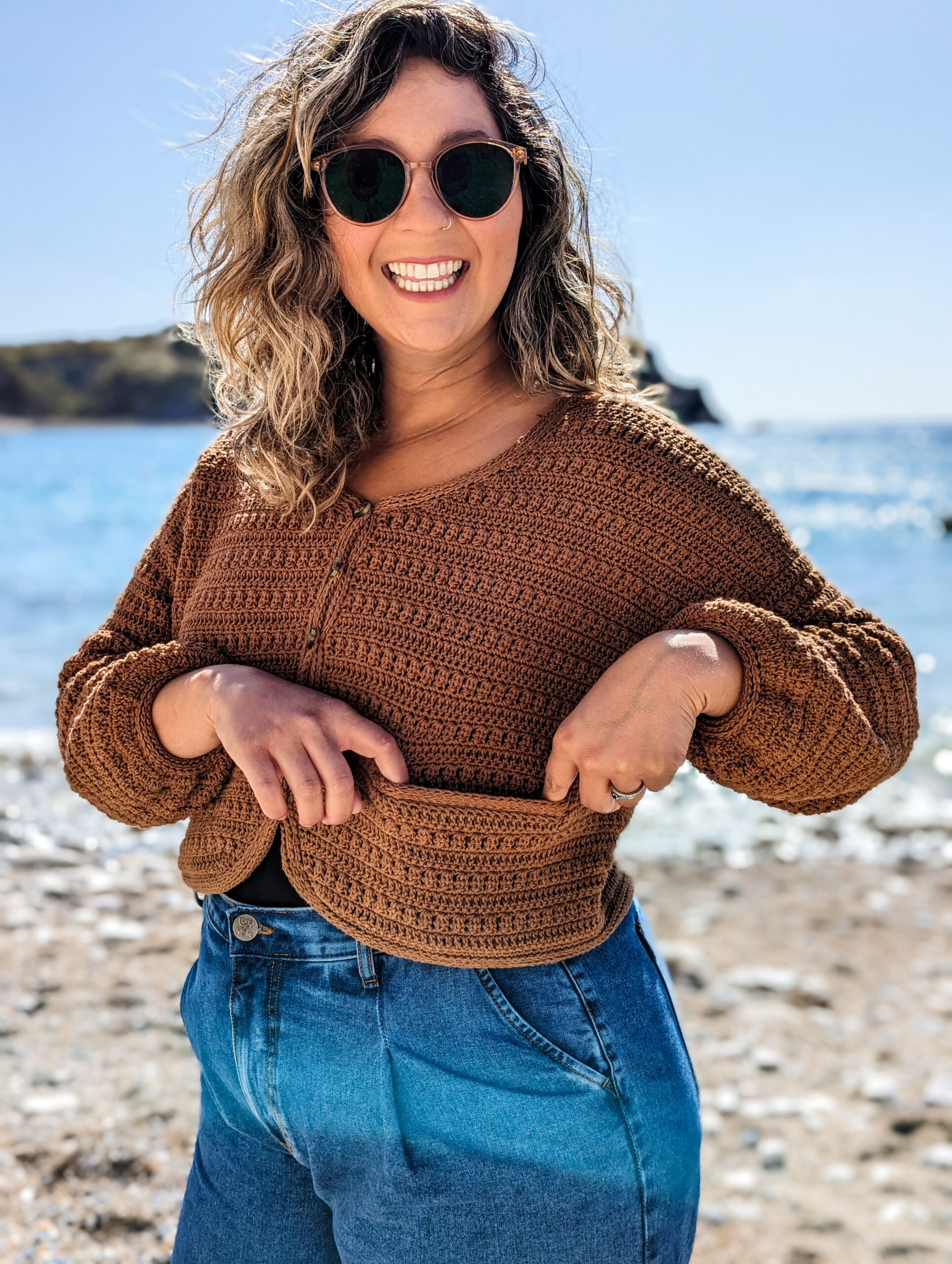- Sport weight yarn:This option is perfect for a light summer cardigan since the stitches are open, lacy and airy. Use cotton, linen or bamboo for warmer climates (as in the brown sample). Use wool for cooler weather while still keeping the fabric light.