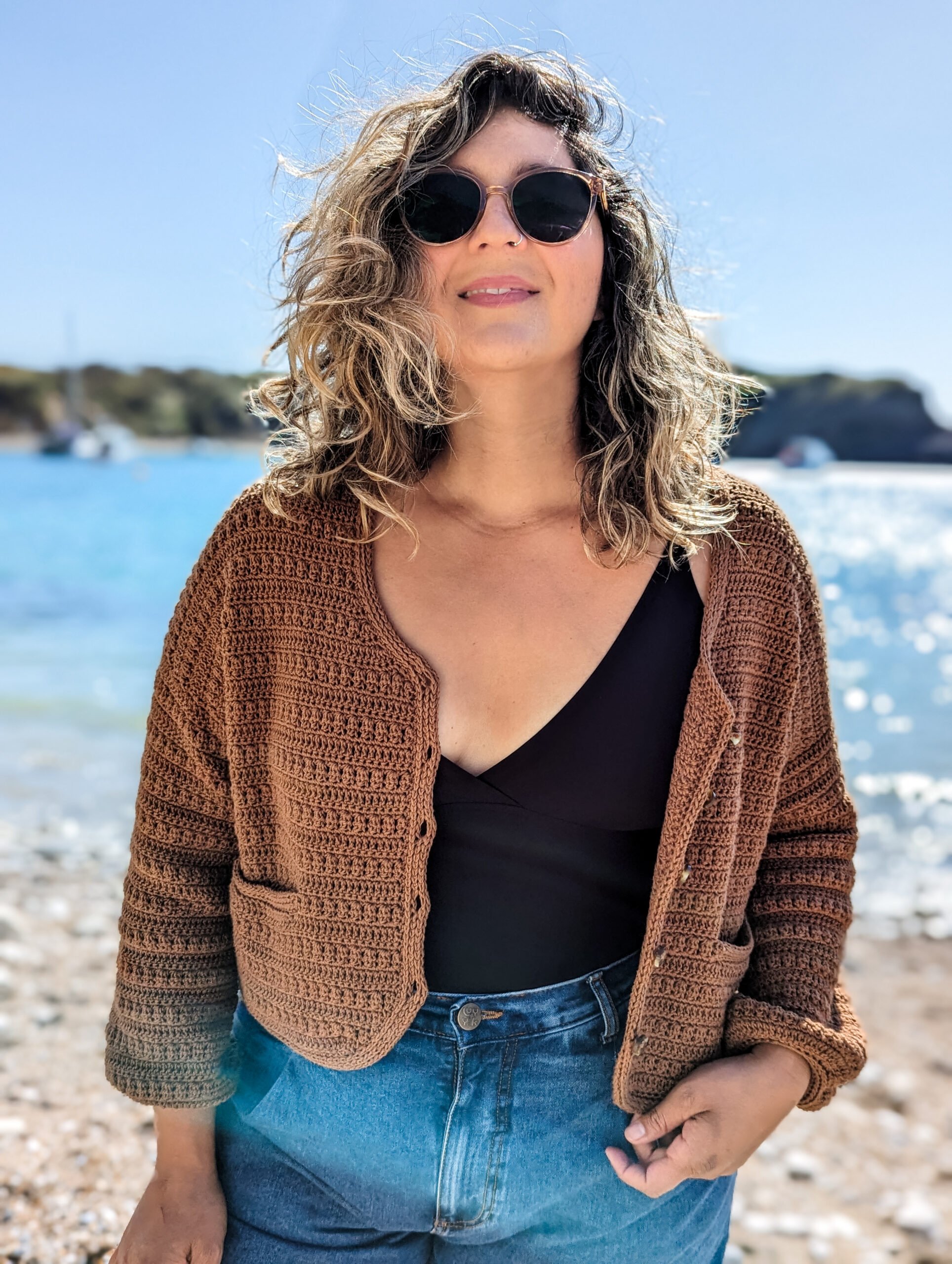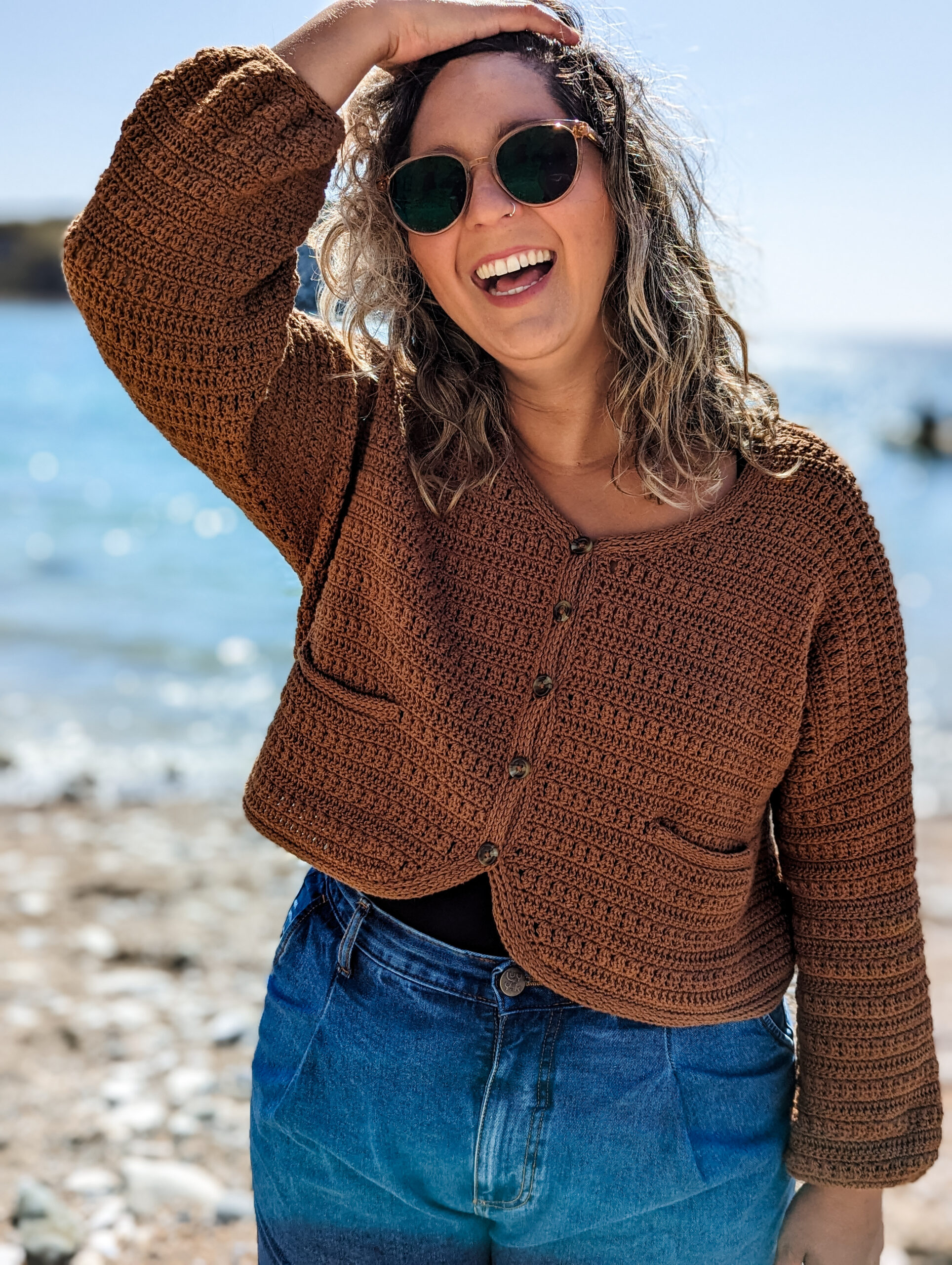 Yarn used for the Cropped Brown sample is Pascuali, Sole (Sport weight, 90% Pima Cotton, 10% Cashmere Wool, 50g, 140m / 153 yds) in color Cinnamon 89 (11 balls total).
