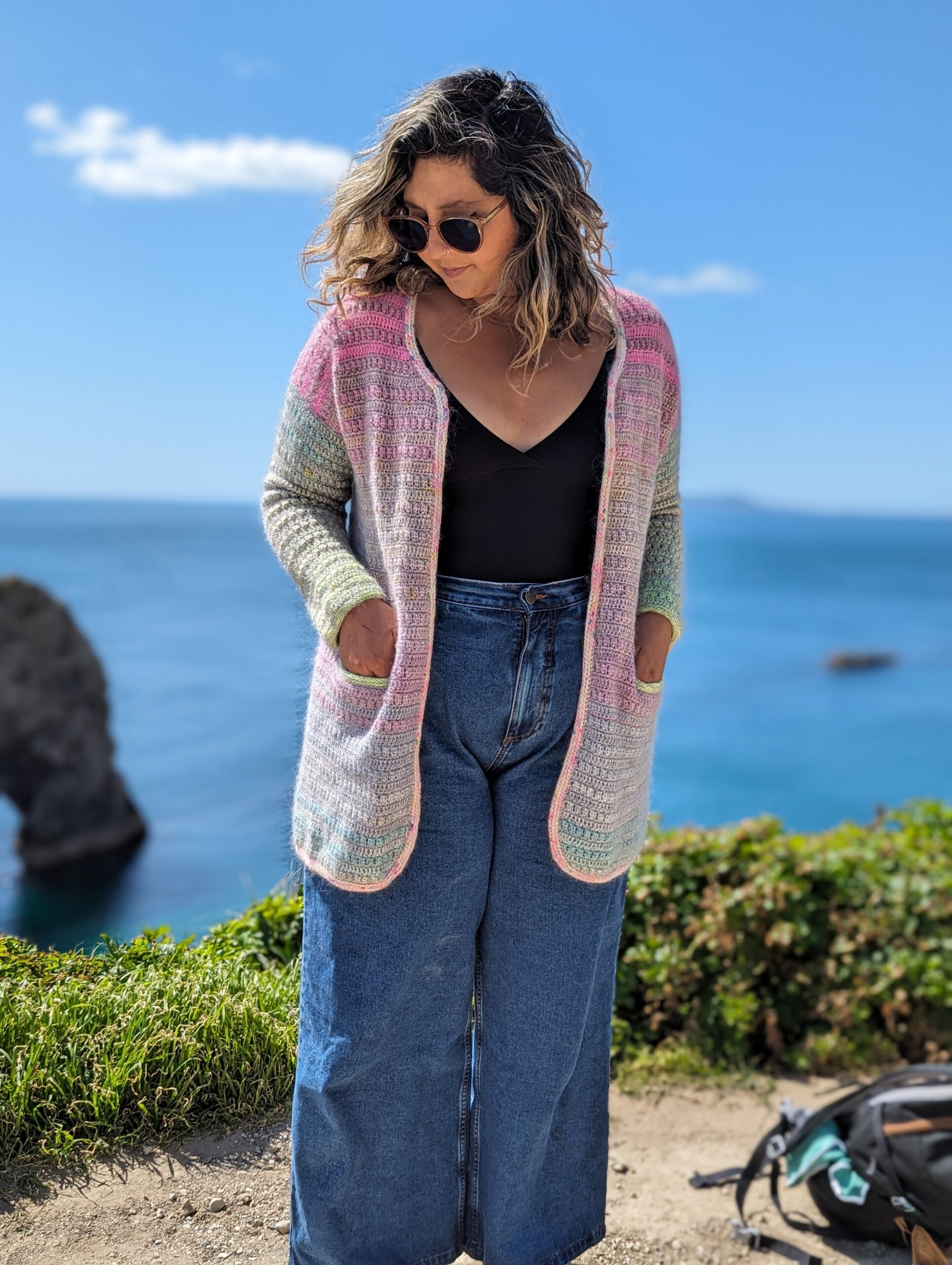 - Fingering weight wool (or wool blend, or wool-like) + mohair–silk lace held double:This combination of yarns creates a light but warm cardigan. Great for transitional weather. The mohair adds a touch of luxury and since yarns are double stranded, it is a great option for stash busting, mixing colors or creating an easy fade effect (as in the pattern sample using minis)