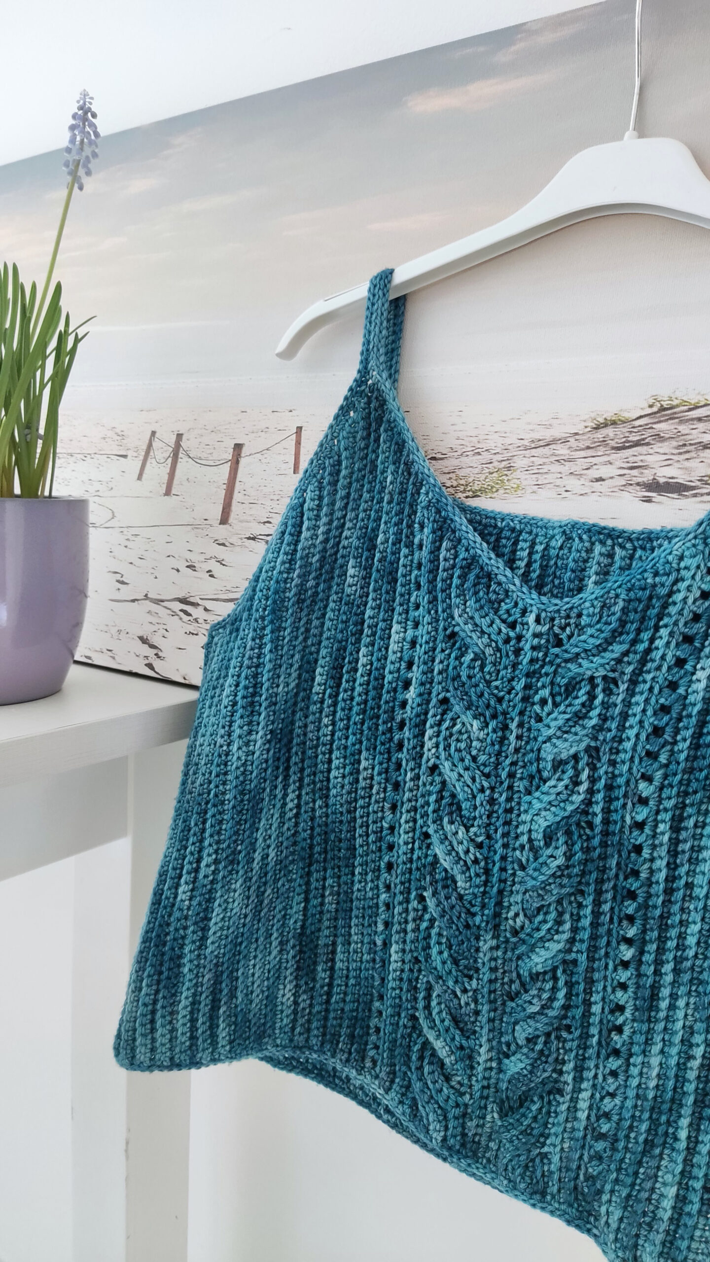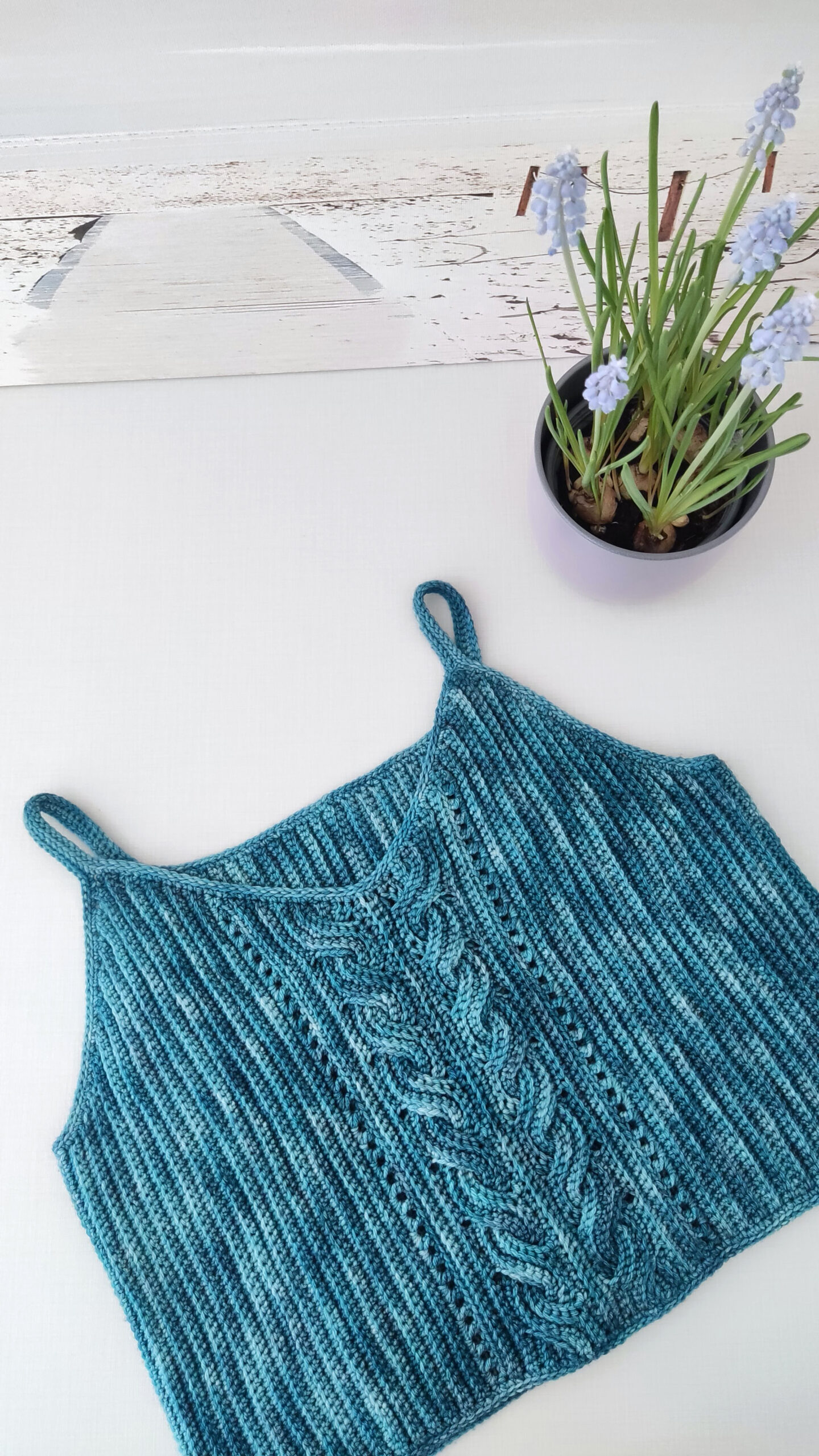 The focal point is a beautiful wide cable at the front, formed by two smaller cables with opposite twists, it is gracefully complemented by a delicate eyelet row on either side. The remainder of the top features straightforward single crochet ribbing, ensuring a smooth and enjoyable crocheting experience.