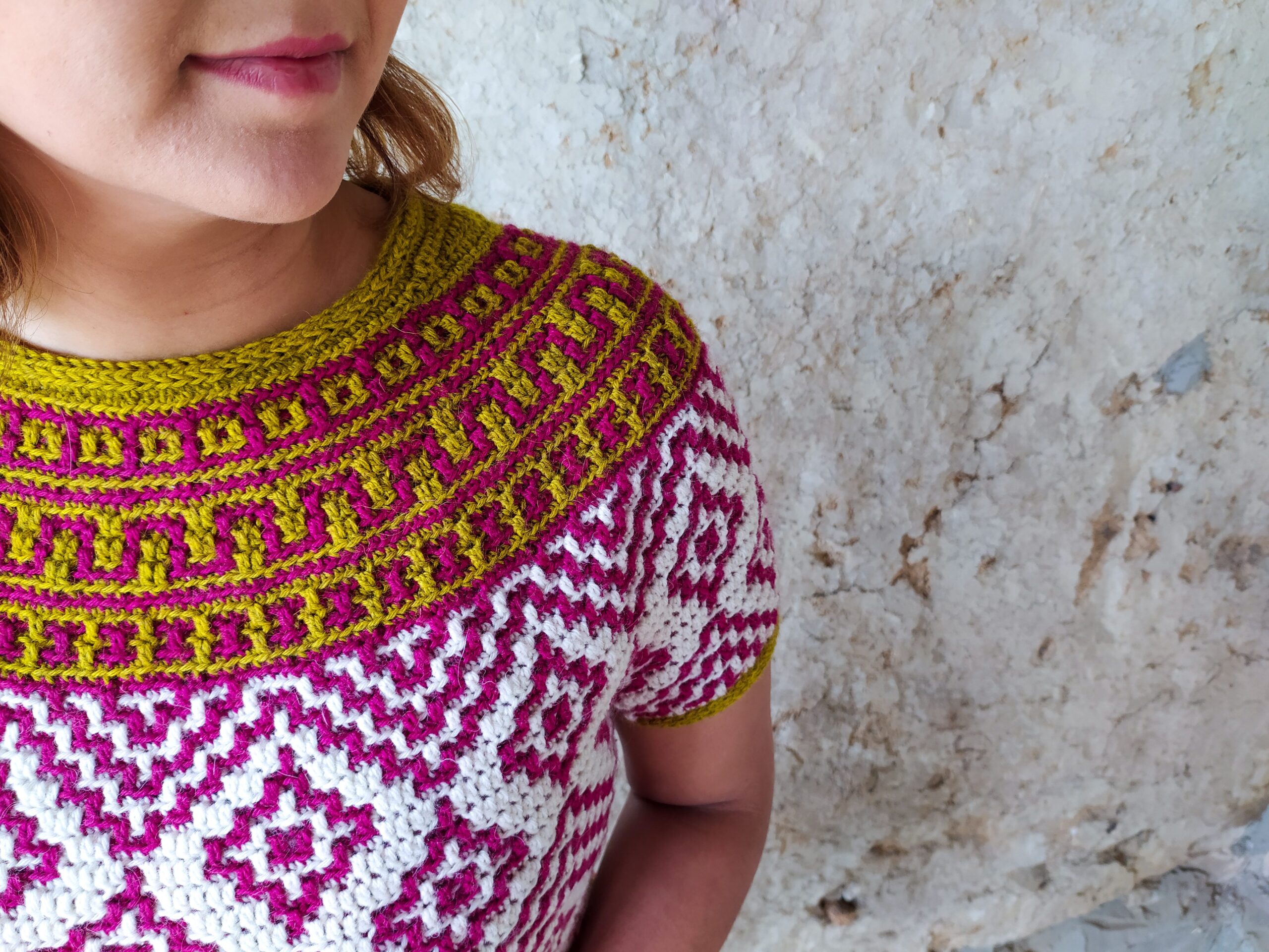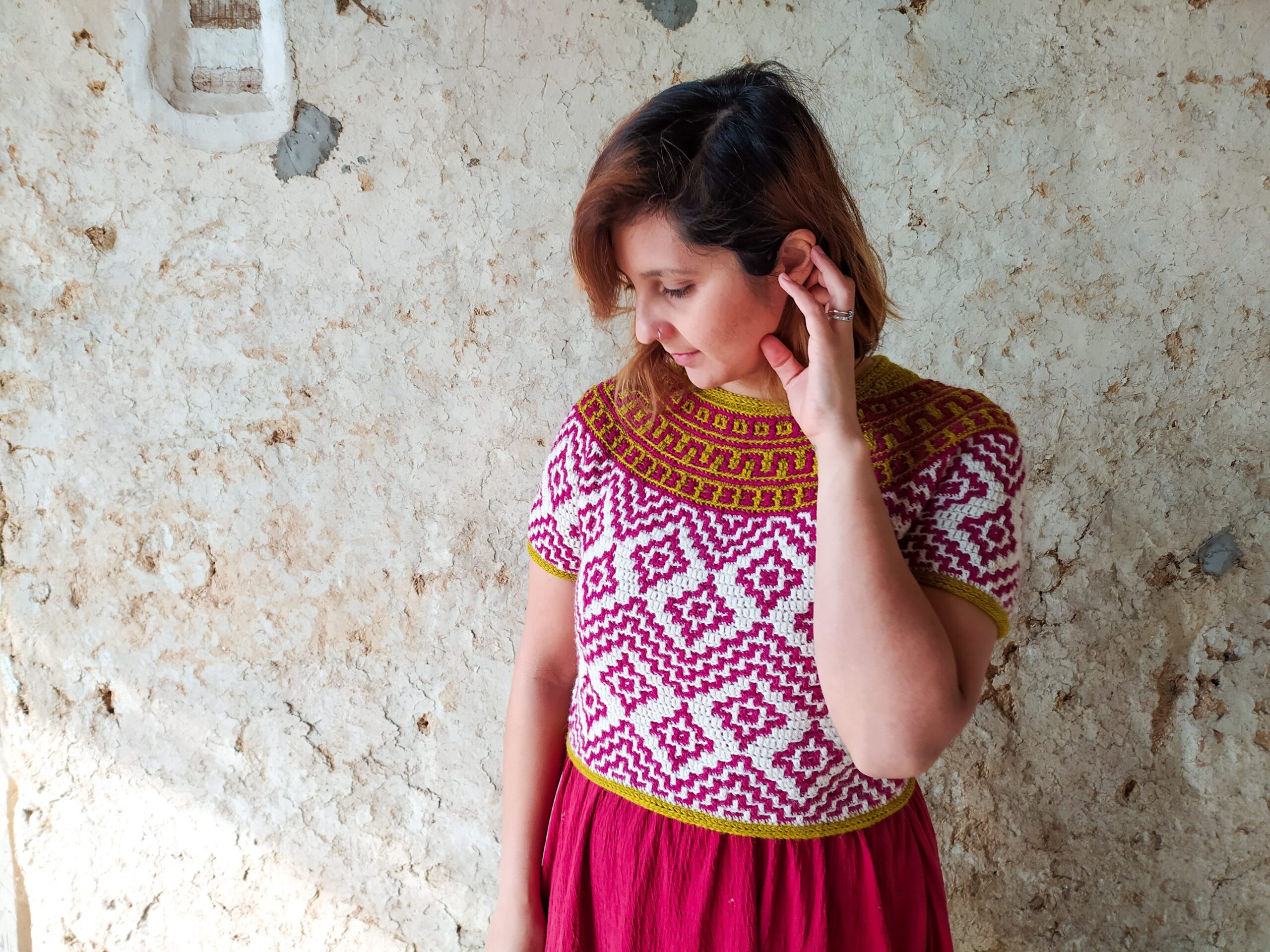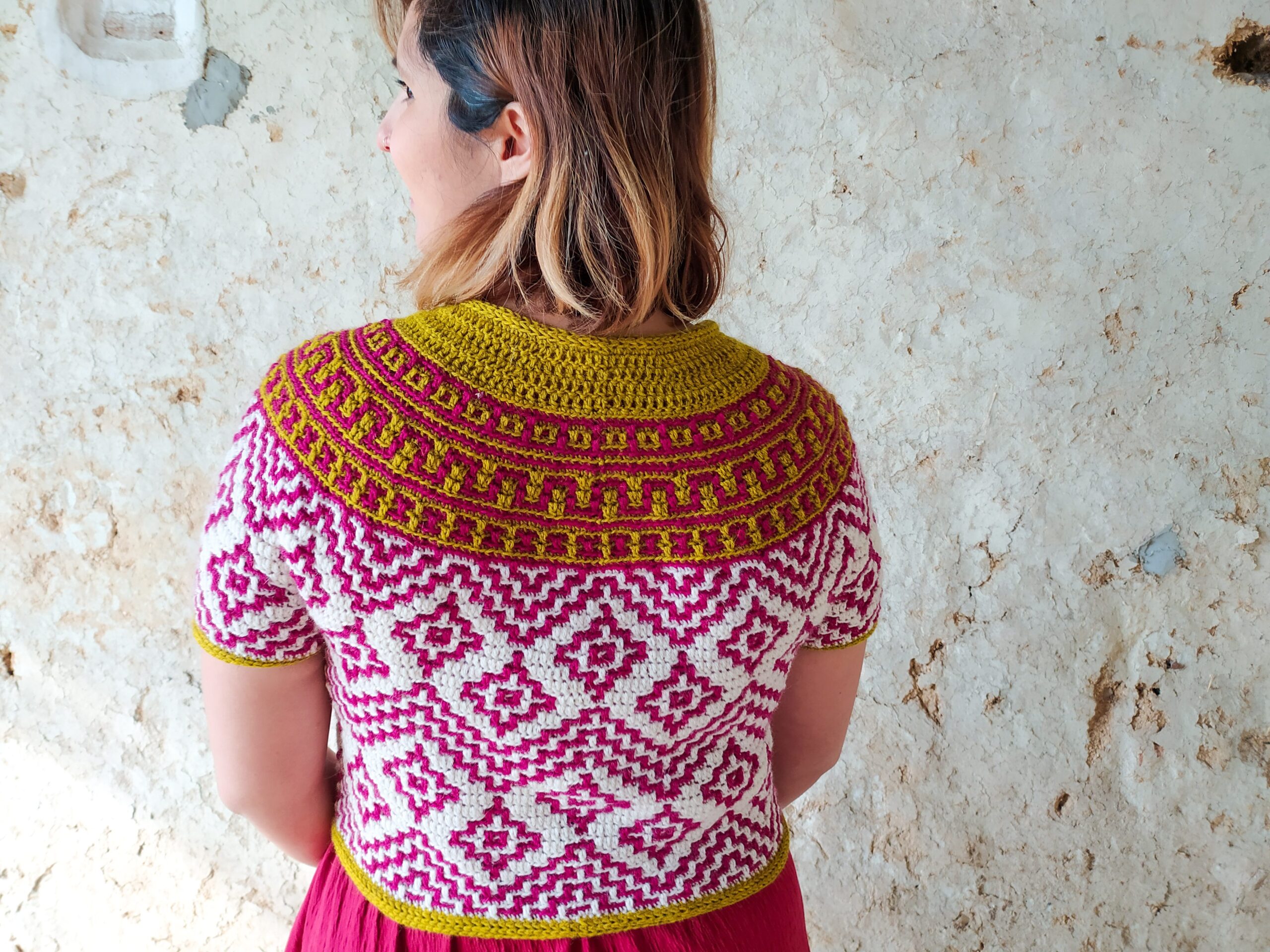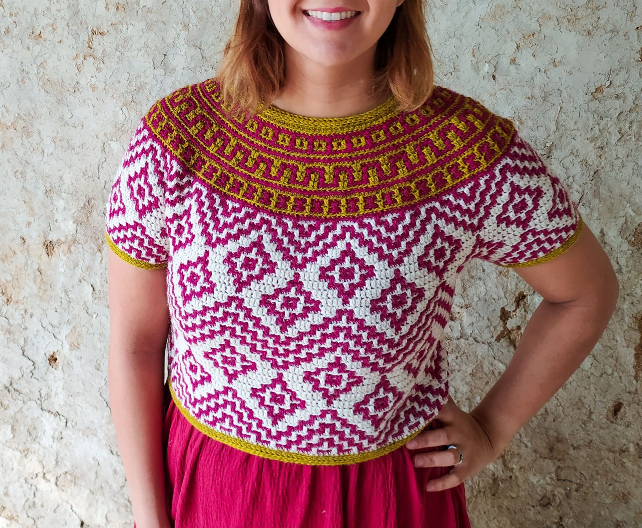 Teotihuacan is an ancient city located in the heart of Mexico. It reminds of the magnificence, beauty and thought that went into these kinds of constructions even at such early times in our history. The top evokes the imagery and shapes found in these pyramids and ancient settlements and will bring so much energy and joy into any wardrobe. It is constructed top-down with short rows at the back of the neck for that perfect fit on the shoulders. The circular yoke and body are worked in rounds. The length of sleeves and body is easily adjustable. The pattern now comes with a coloring page to help you plan your colors!