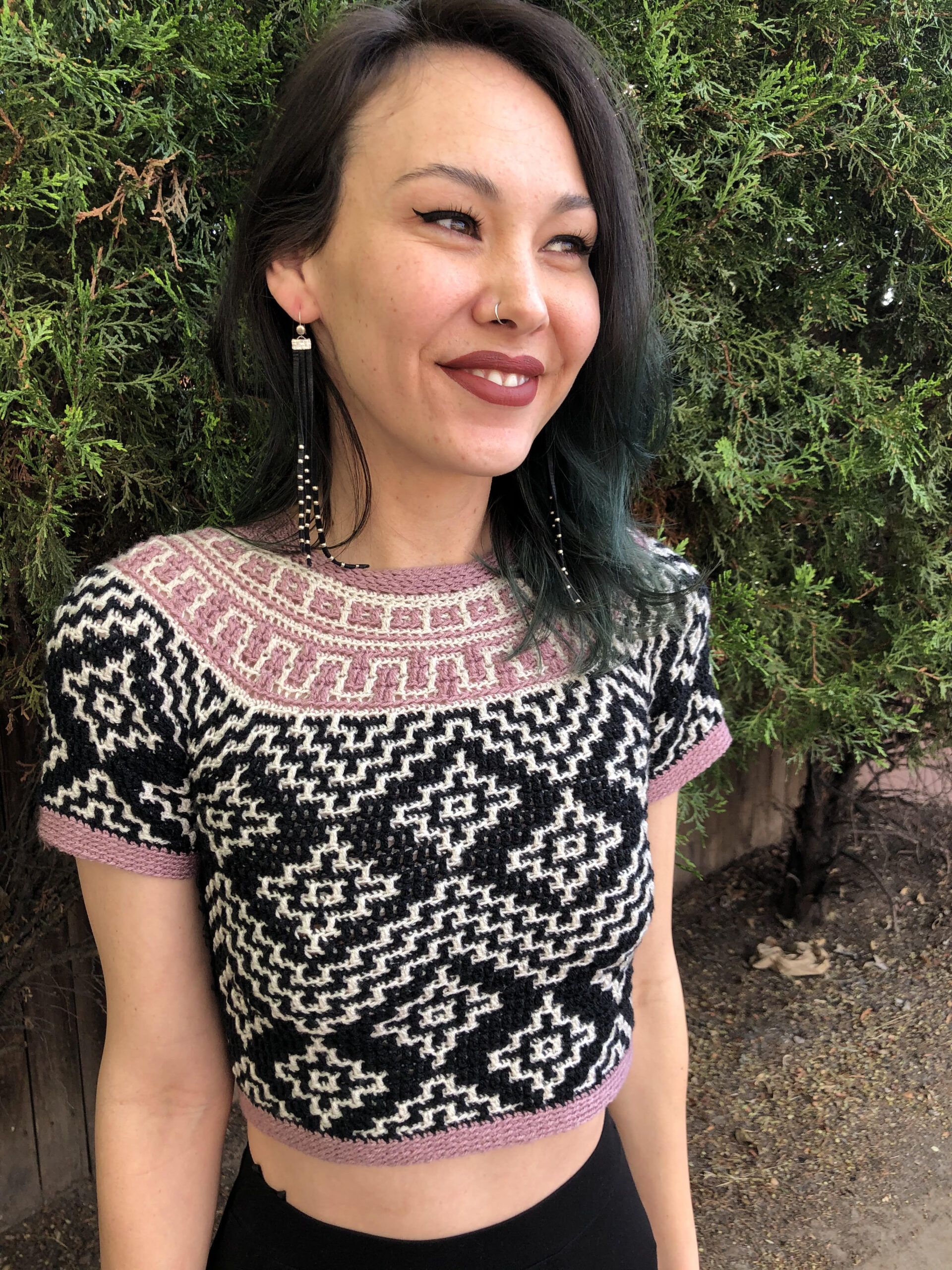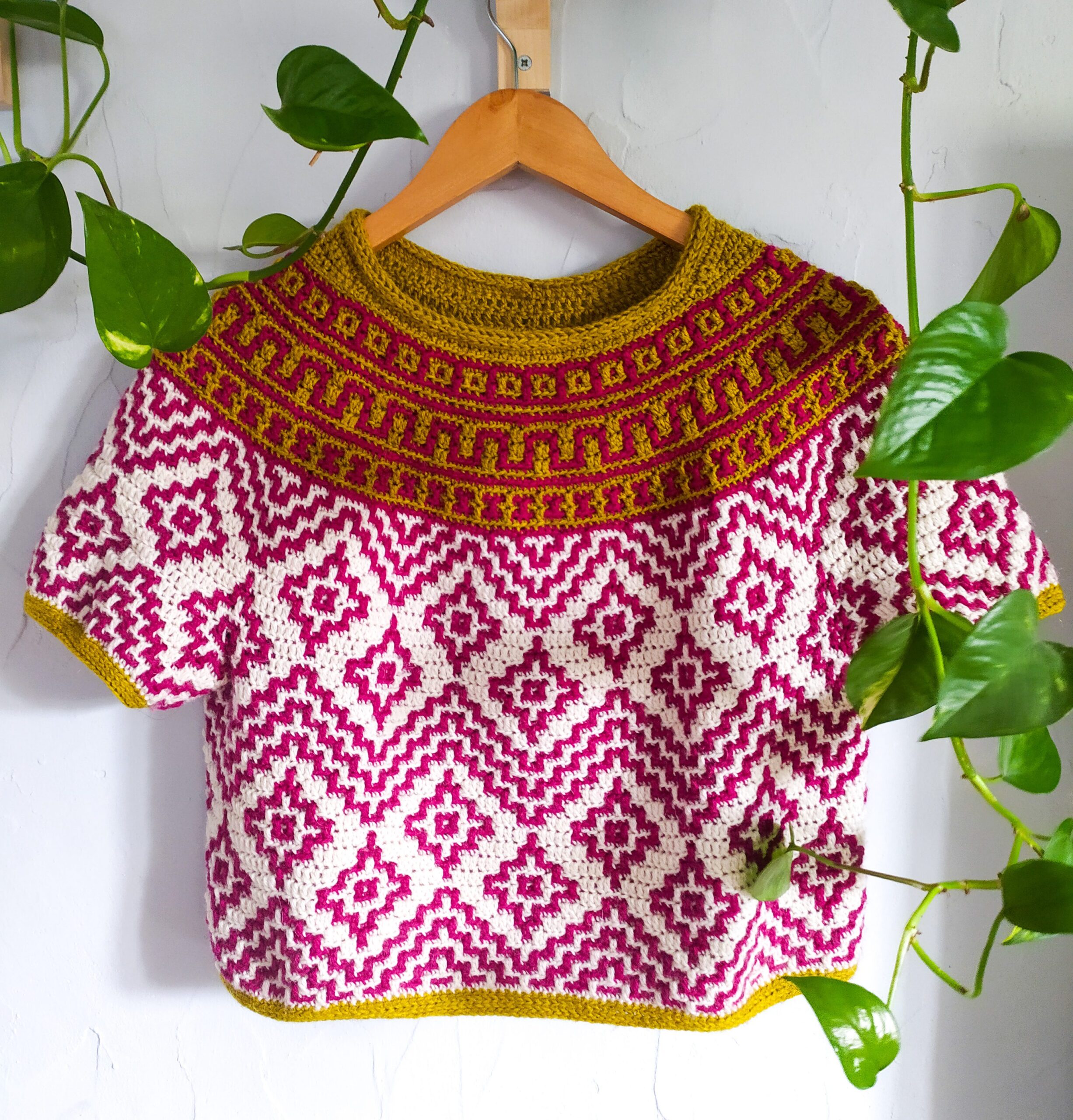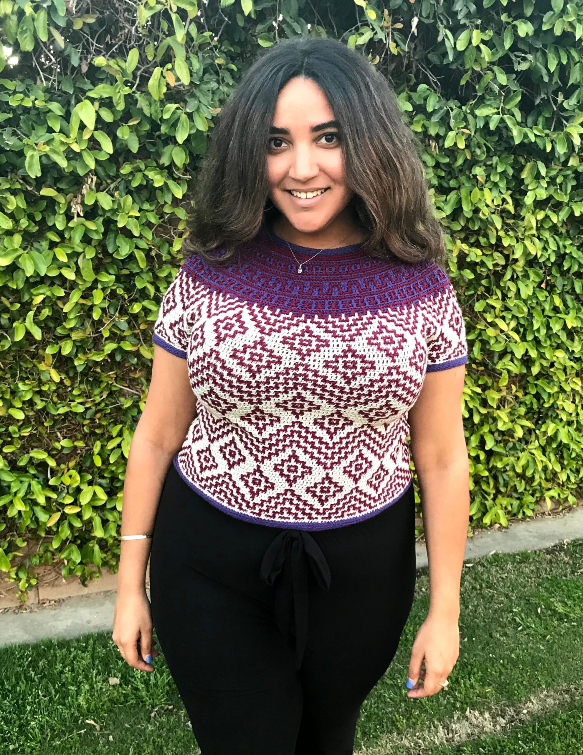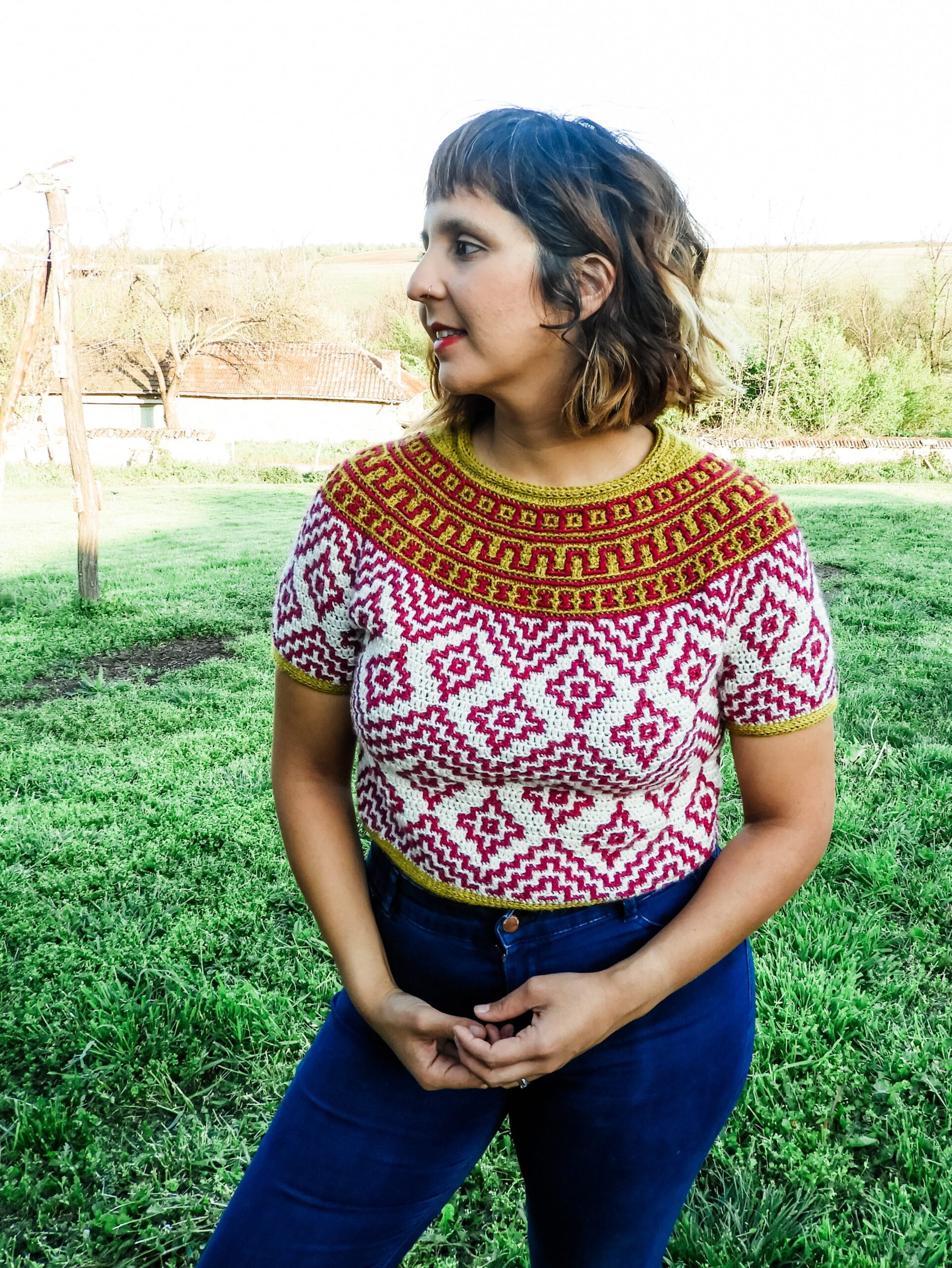 Teotihuacan is an ancient city located in the heart of Mexico. It reminds of the magnificence, beauty and thought that went into these kinds of constructions even at such early times in our history. The top evokes the imagery and shapes found in these pyramids and ancient settlements and will bring so much energy and joy into any wardrobe. It is constructed top-down with short rows at the back of the neck for that perfect fit on the shoulders. The circular yoke and body are worked in rounds. The length of sleeves and body is easily adjustable. The pattern now comes with a coloring page to help you plan your colors!