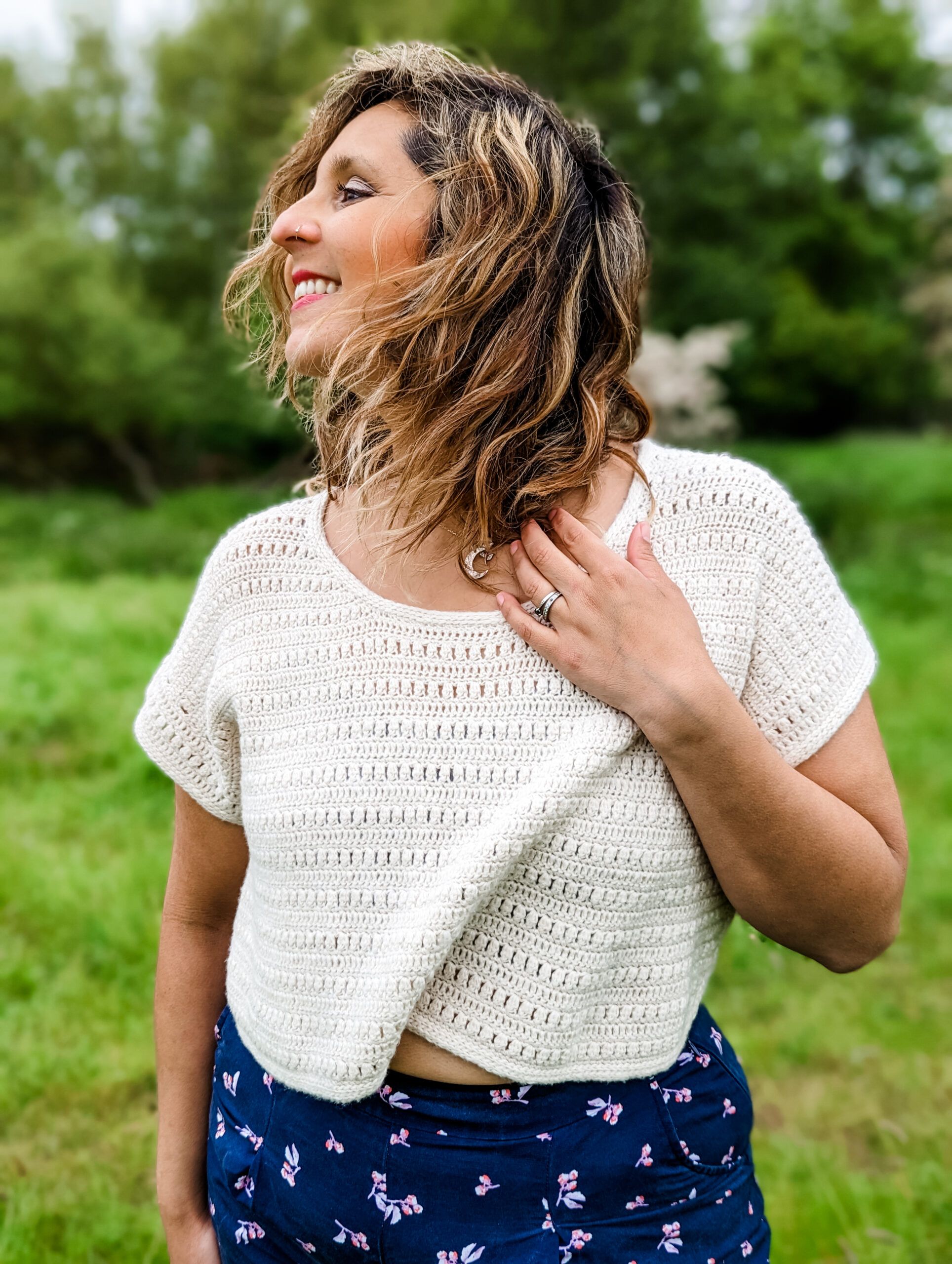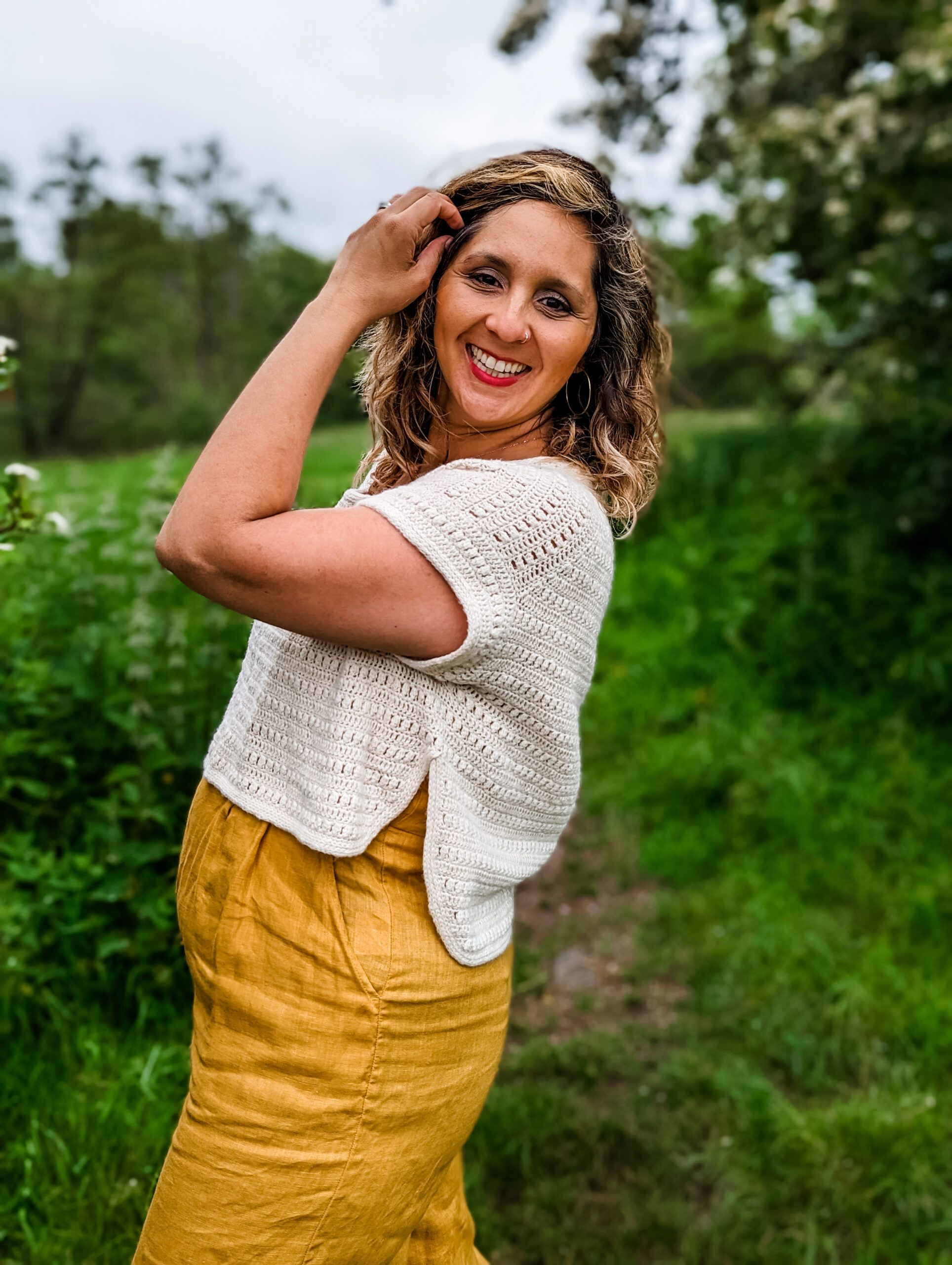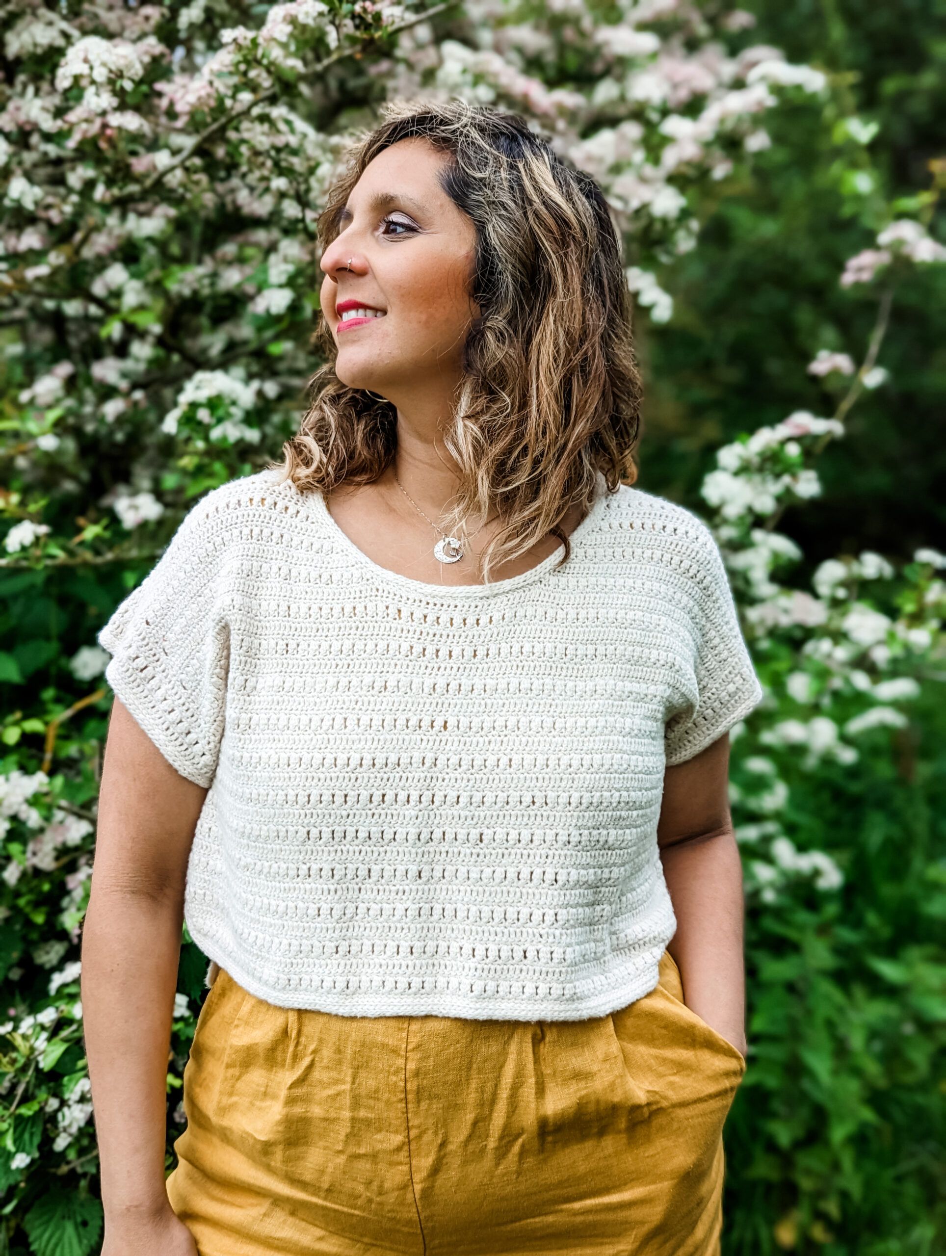 Sample used Pascuali, Suave (100% Organic Cotton, 25g, 162 m / 177 yds) in color Cream (50). Approx 6 (6, 7, 8, 8) (9, 9, 10, 11) balls used for a cropped high-low hem as in pictures.